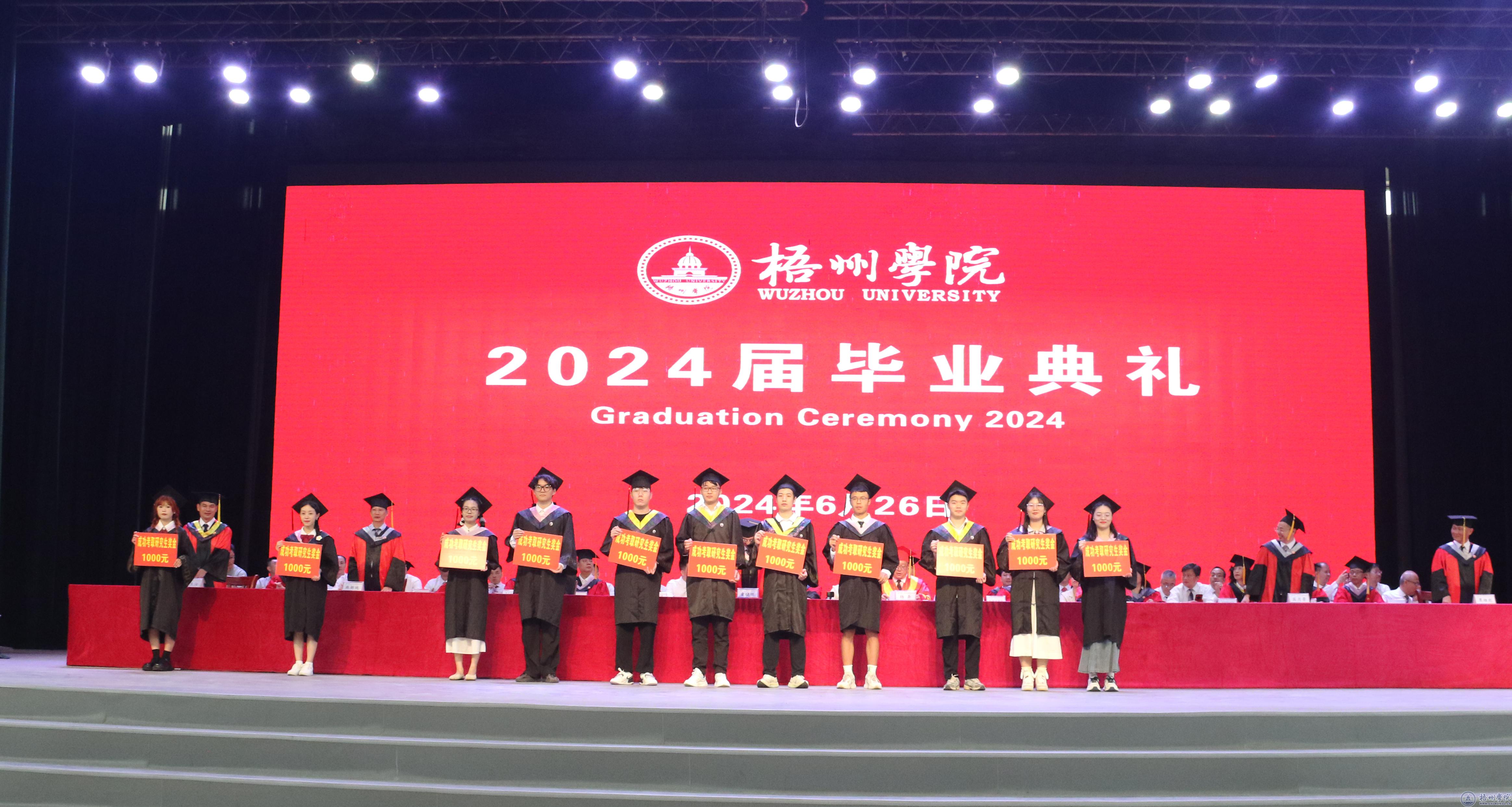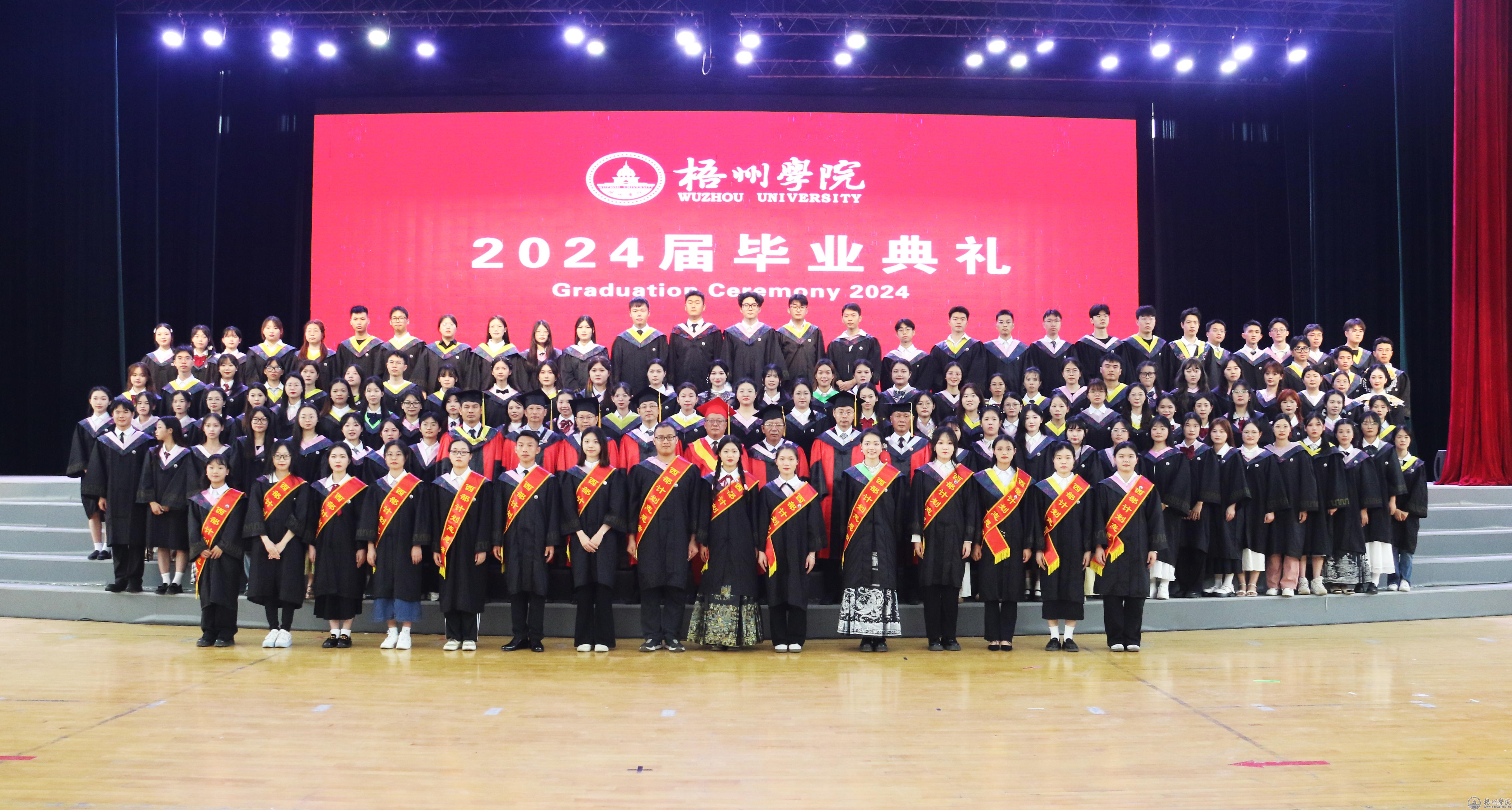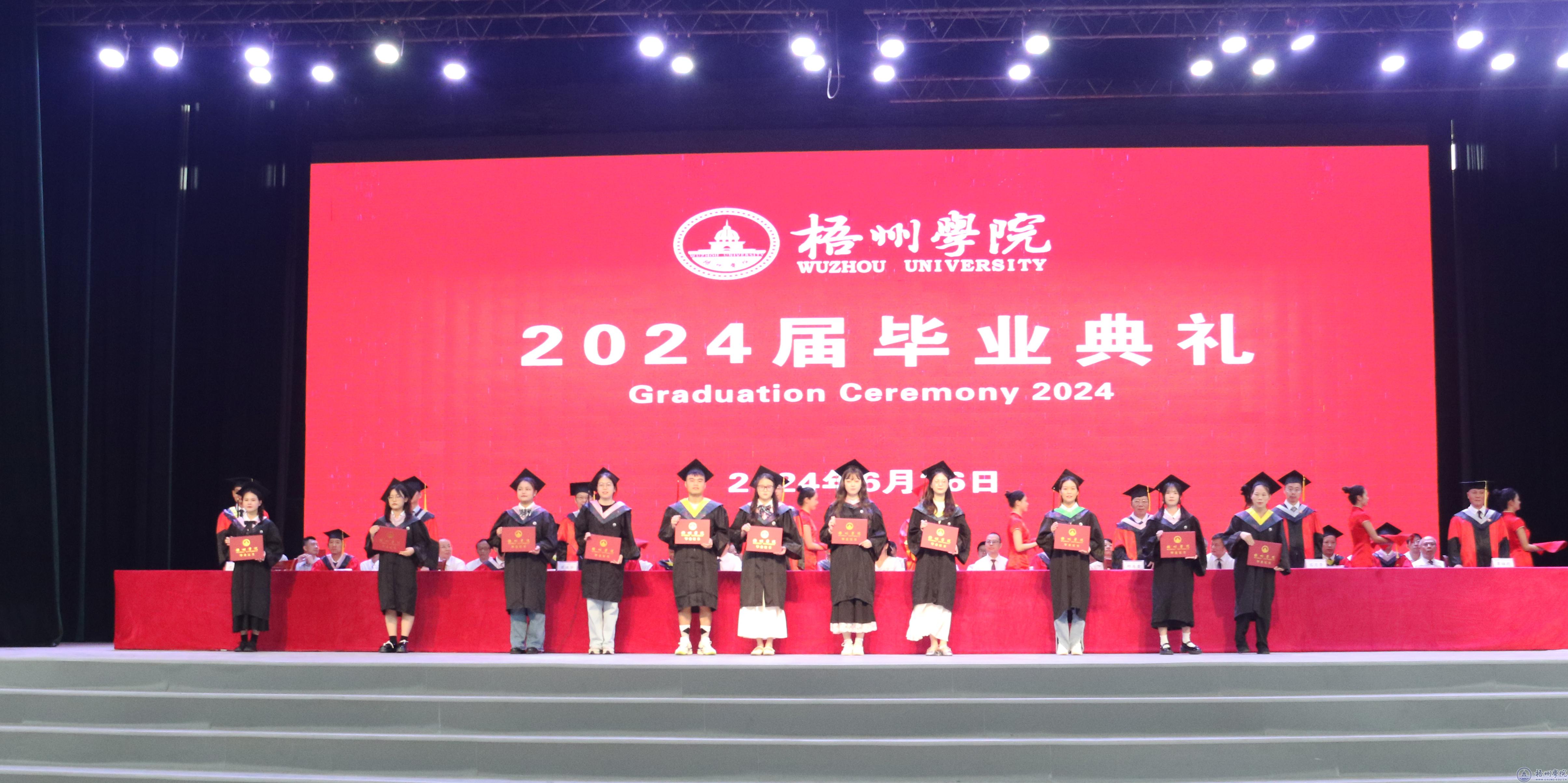 毕业典礼在嘹亮的国歌声中拉开帷幕。副校长覃雄彪宣读我校关于准予2024届普通全日制本专科学生毕业的文件,学校领导为毕业生代表颁发毕业证书。副校长邱房贵宣读自治区教育厅关于认定2024届自治区普通高等教育优秀毕业生的文件,学校领导为自治区2024届普通高等教育优秀毕业生代表颁发荣誉证书。副校长麻新纯宣读我校关于表彰2024届普通高等教育优秀毕业生的文件,学校领导为我校2024届普通高等教育优秀毕业生代表颁发荣誉证书。纪委书记宾月景宣读我校2024届普通高等教育毕业生考取硕士研究生名单,学校领导为考取硕士研究生的毕业生代表发放奖金。副校长范生汝宣读入选2024年西部计划志愿者毕业生名单,学校领导为入选2024年西部计划志愿者发放补助金,为2024届全体毕业生代表赠送纪念品。