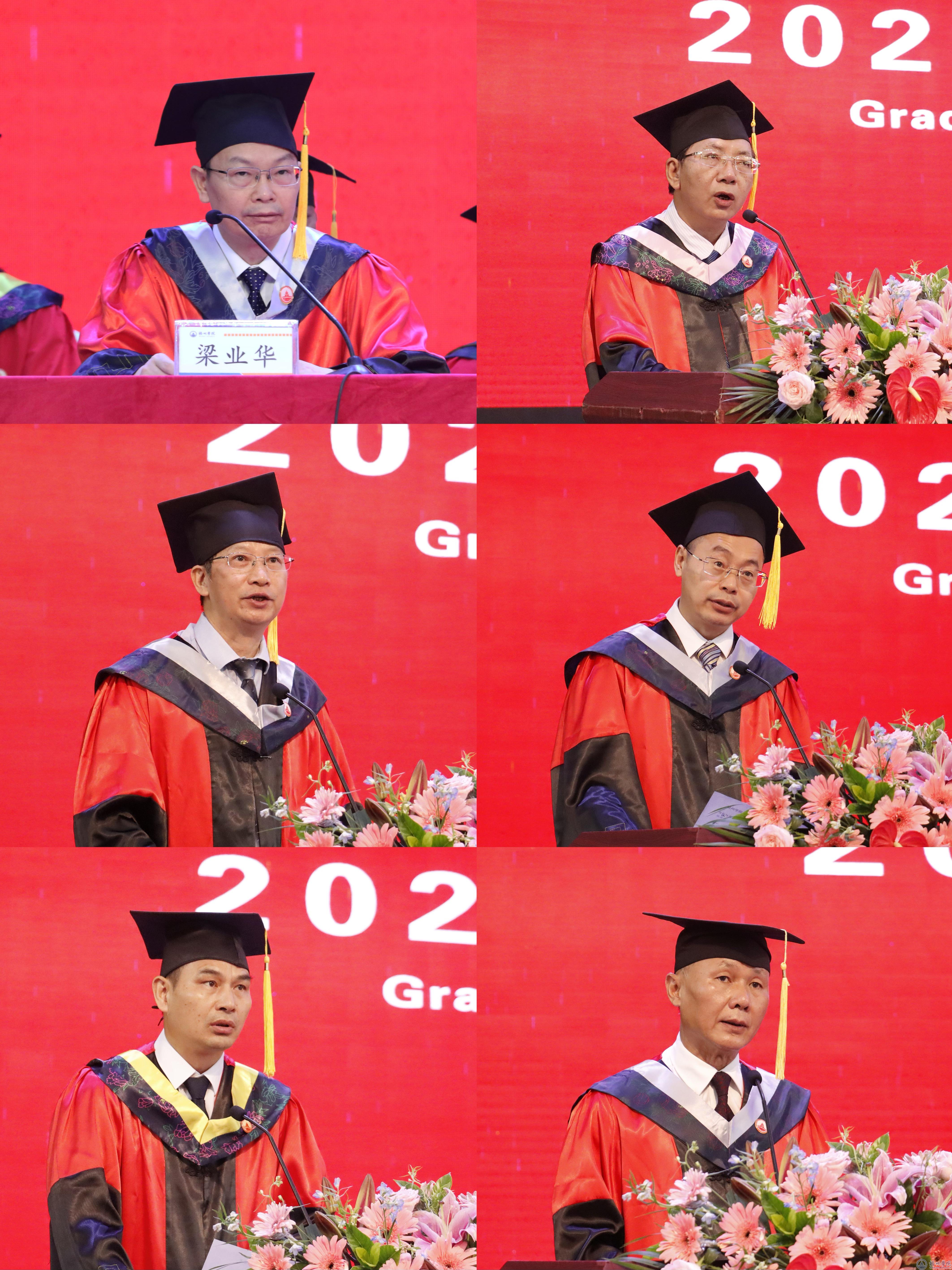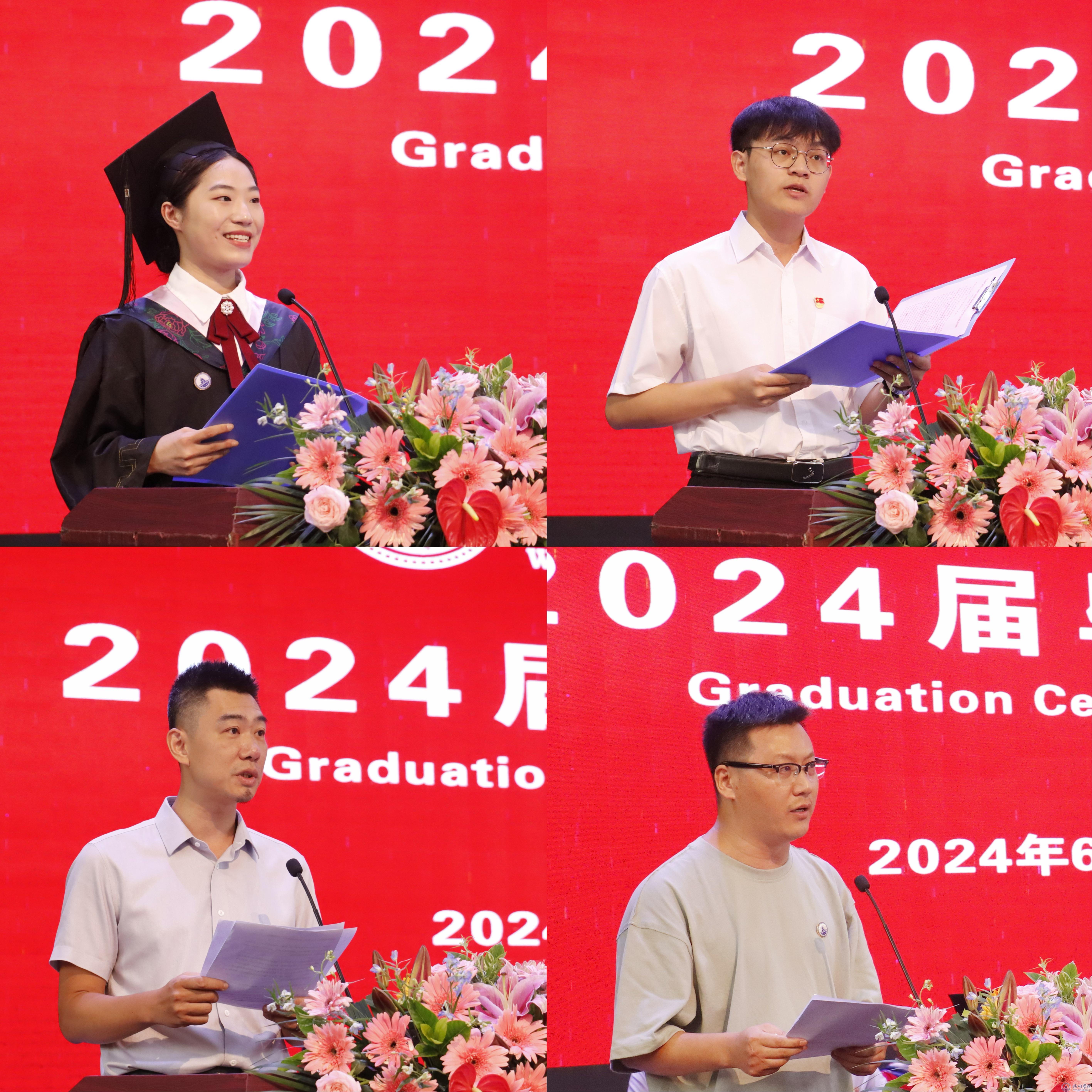 外国语学院2020级英语1班童文静代表应届毕业生发言,她回顾了四年大学生活的美好时光,感恩母校悉心栽培,并表示将坚定信念,勇担重任,迈向人生新的征程。电子与信息工程学院2021级通信1班余亮代表在校学生发言,感谢学长学姐的关照和帮助,让自己的大学生活充满色彩,并代表在校生祝愿所有毕业生前程似锦,一路繁花。管理学院副教授梁尹杰代表教师发言,他向所有毕业生分享“毕业生存指南”,并寄语强调好奇心、合作与乐观精神,祝愿毕业生前程似锦,实现梦想。我校2007级工商管理专业毕业生,现在华侨大学工作的张振岳,代表校友发言,他深情回顾大学期间的生活,感恩母校赋予的名誉、老师给予的指导以及时代带来的机遇,同时鼓励在校的学弟学妹们珍惜时光,努力奋斗,实现个人的梦想和目标。