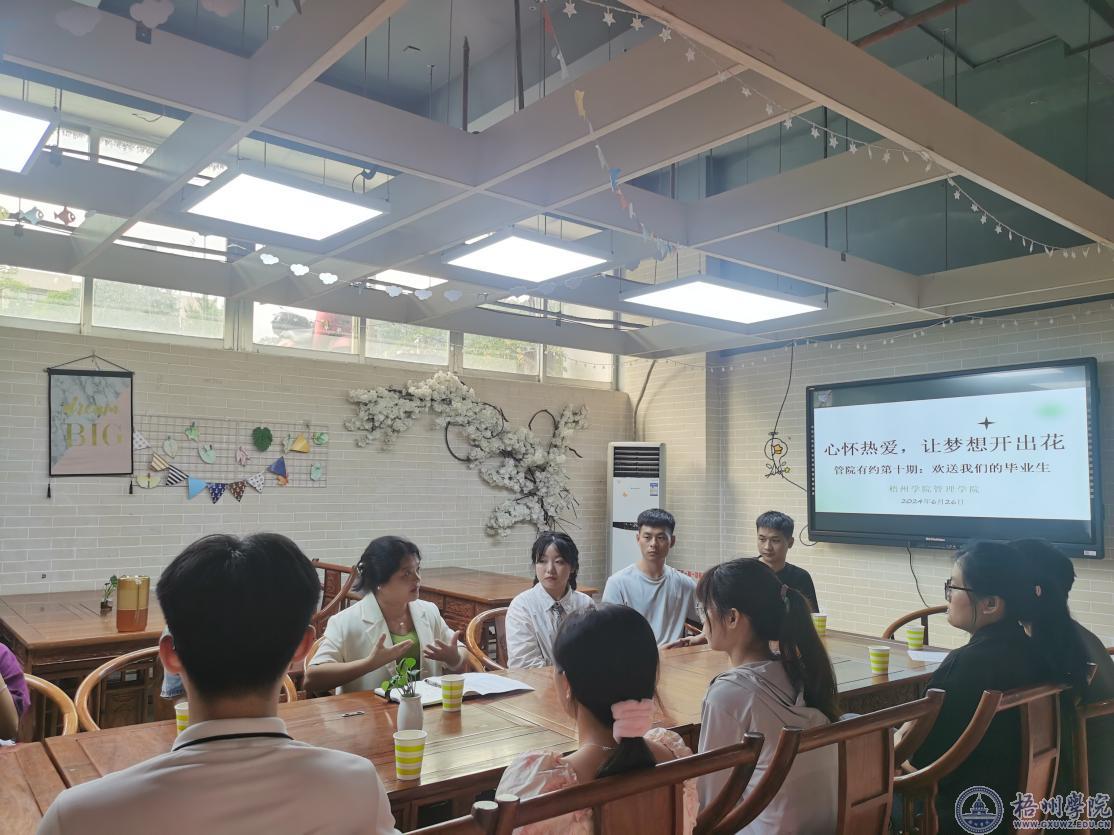 鸳鸯水涨,骊歌声慢,又是一年离别时。6月26日下午,管理学院在E茶空间举行主题为“心怀热爱,让梦想开出花”毕业生座谈会。座谈会由院长张堂云主持,管理学院教师、辅导员和毕业生代表参加座谈会。