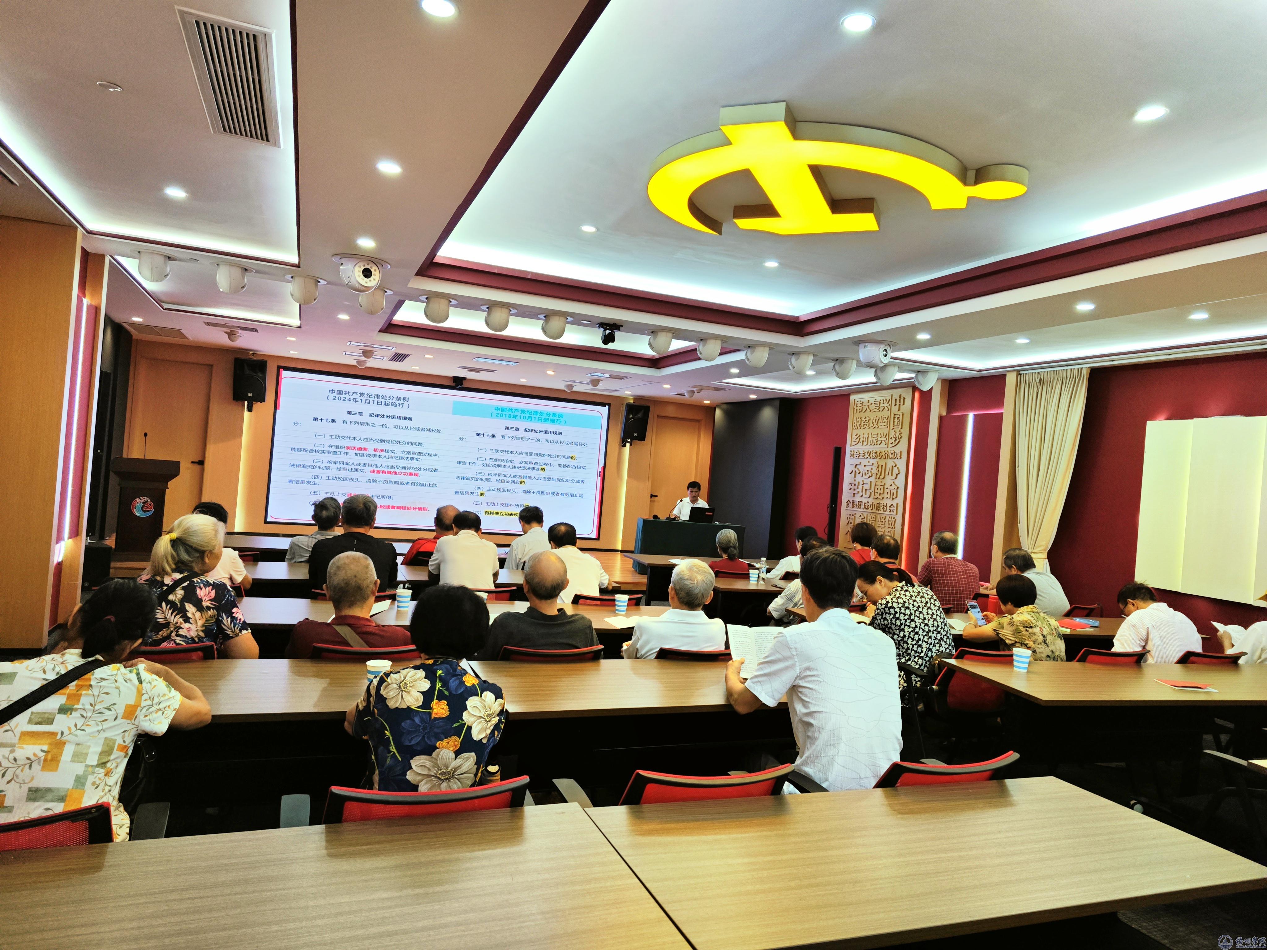 6月27日上午,离退休教职工党总支在梧州市党群服务中心举办党纪专题学习辅导报告会,由离退休教职工党总支副书记李远林作辅导报告,50多名退休党员参加。