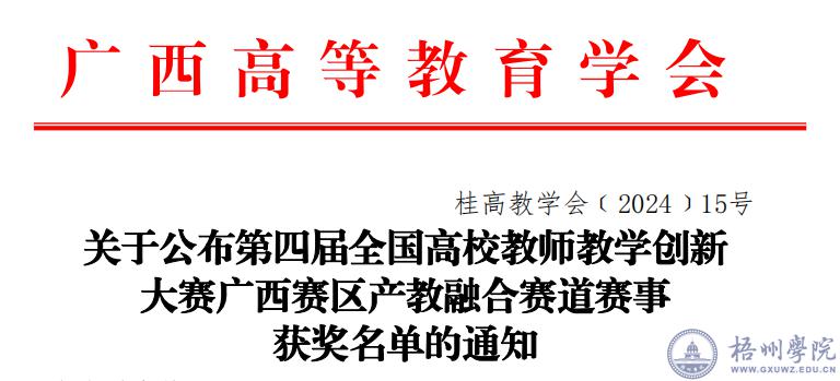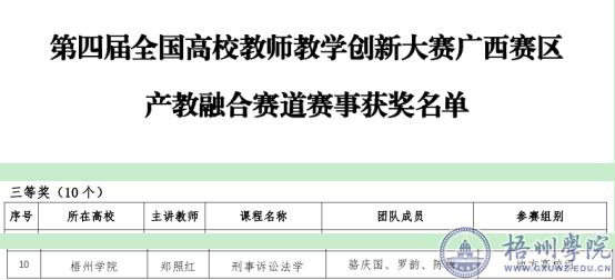 根据《关于举办第四届全国高校教师教学创新大赛广西赛区产教融合赛道赛事的通知》(桂高教学会〔2024〕7 号),全区 22 所高校 33 位教师(团队)参加了第四届全国高校教师教学创新大赛广西赛区产教融合赛道的比赛,依据网络评审及现场评审,共评出一等奖 2 项、二等奖 8 项、三等奖 10 项;我校法学院郑照红老师参赛团队的《刑事诉讼法学》课程荣获区赛三等奖。