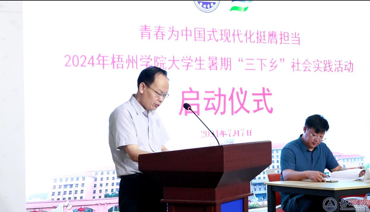 梁业华指出,实践育人是我校落实立德树人根本任务的重要抓手之一,本次暑期“三下乡”社会实践活动是引导和帮助青年学生学好与现实相结合的“大思政课”而组织实施的一次重要活动,希望同学们要继承和发扬五四精神,把握社会实践宝贵机会,展现青春作为、彰显青春风采。他对活动开展提出四点要求:一要了解国情、认知社会,厚植爱国情怀,希望同学们深入基层一线,用脚步丈量祖国大地,用眼睛发现中国精神,用耳朵倾听人民呼声,用内心感应时代脉搏。二要虚心学习、磨炼意志,树立良好形象,要发扬“自找苦吃”精神、在艰难困苦中历练成长,展现梧院学子良好的精神风貌。三要紧扣主题、突出专业特色创新载体,进一步深化“一院一品牌”的实践成果。四要强化安全保障,守牢风险底线,师生身体健康和生命安全始终放在第一位。