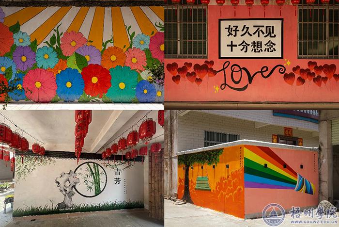 7月正值炎暑,志愿者们克服了炎热天气困难,在复杂的墙面上精心调色,绘制出一幅幅美丽的画面,引起路过的村民驻足观看。在志愿者们的共同努力下,打造出“覃家大院”“我也喜欢古芳”“海边风景”“桃花林中的小火车”等7处网红打卡点,为乡村振兴示范点增添了文化元素。