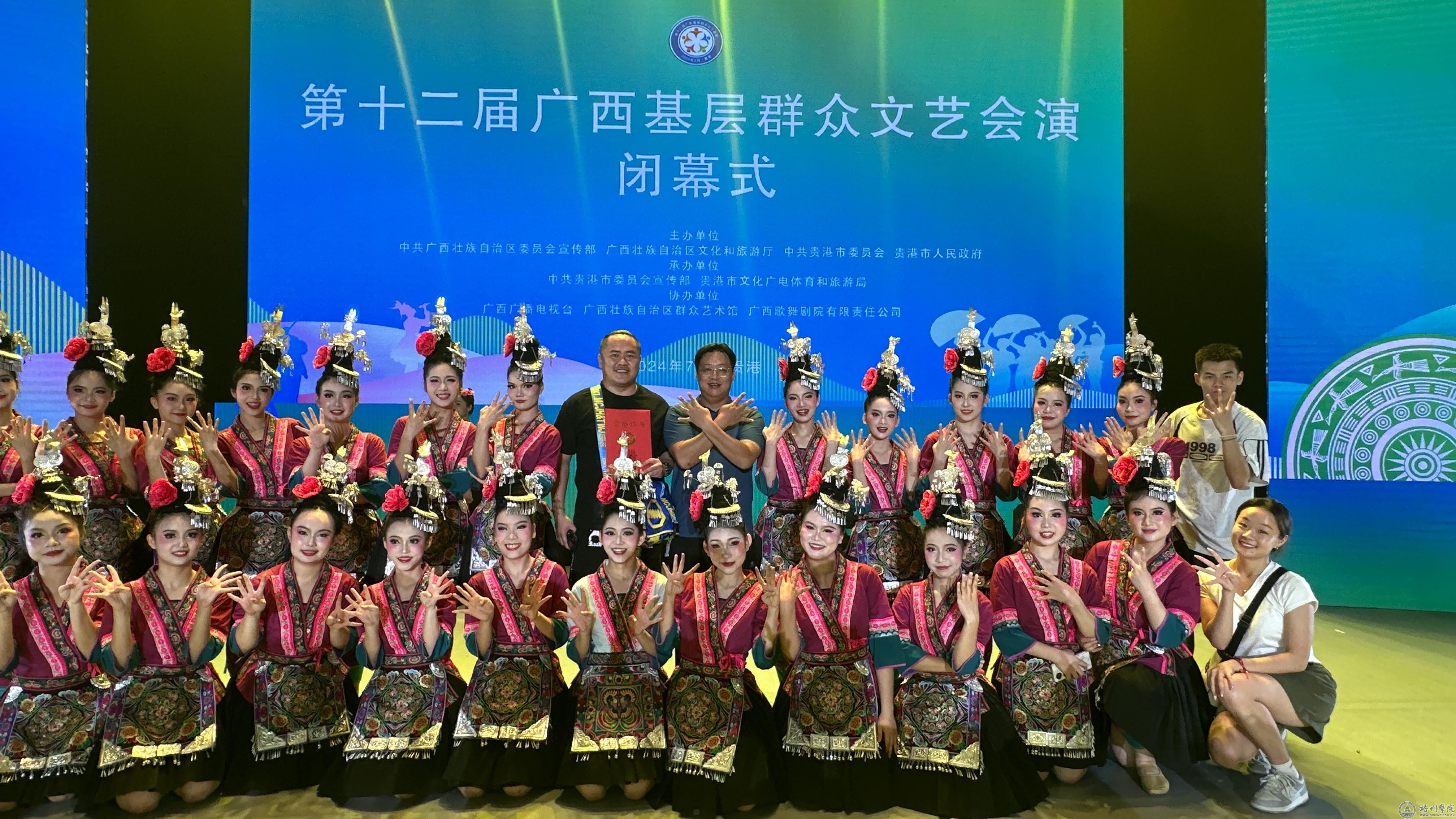 7月16日,第十二届广西基层群众文艺会演闭幕式在贵港市行政会议中心大会堂举行,舞蹈《一布一生》受邀参加了闭幕式演出,向全区人民展示我校美育工作成果和大学生积极向上的精神风貌。