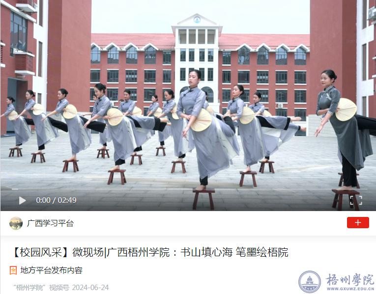 近日,由党委宣传部制作,梁志慧老师担任导演,许洪浩、苏承瑜、陆碧梅拍摄,马庆斌剪辑的《书山填心海,笔墨绘梧院》视频作品,被“学习强国”的“广西学习平台”转载刊播。