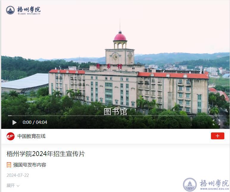 由招生办制作的梧州学院2024年招生宣传片被“学习强国”的“中国教育在线”平台转载刊播,引起了广泛关注。我校一直致力于提升教育质量和宣传工作,此次招生宣传片的精彩呈现,充分展示了学校的特色与优势。该宣传片通过生动的画面,展现了梧州学院的校园风貌、师资力量、学科建设以及学生的成长与发展。