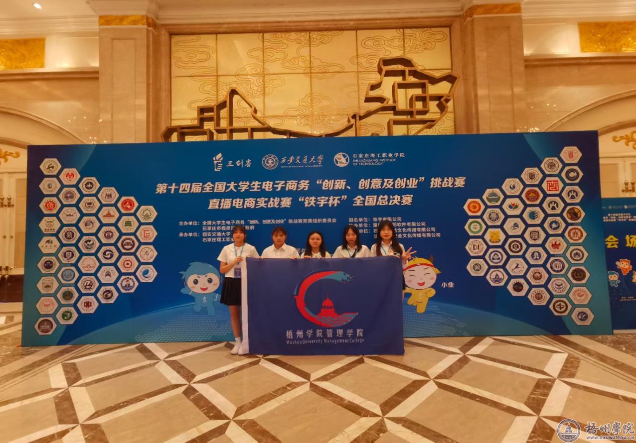 第十四届全国大学生电子商务“创新、创意及创业”挑战赛直播电商实战赛“铁宇杯”全国总决赛7月24日至26日在石家庄理工职业学院举行。本次比赛共有全国高校87支队伍入围,由我校管理学院21人力资源管理本科班学生粟红霞、郭静雯、李惠珊、张晓菲、卢冬丽组成的团队参加区赛获得特等奖,成功入围全国总决赛,经过现场汇报和答辩评审,《知食小铺》项目获国赛一等奖,江永浩、陈献宁两位老师获得优秀指导老师称号。