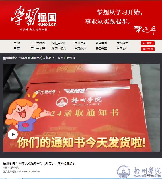 由宣传部制作,许丽娟拍摄,马庆斌剪辑的视频《梧州学院2024年录取通知书今天邮寄了,萌新们请接收》被“学习强国”转载刊播。该视频拍摄了工作人员打包、邮寄2024录取通知书的场面,一份份录取通知书都代表了我们期待新生到来的愉悦与热情。