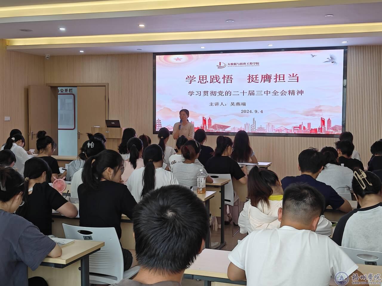 9月4日,大数据与软件工程学院党委在K902开展“学思践悟,挺膺担当”主题党课,本次党课由学院党委书记吴燕端主讲,全体学生党员参加。