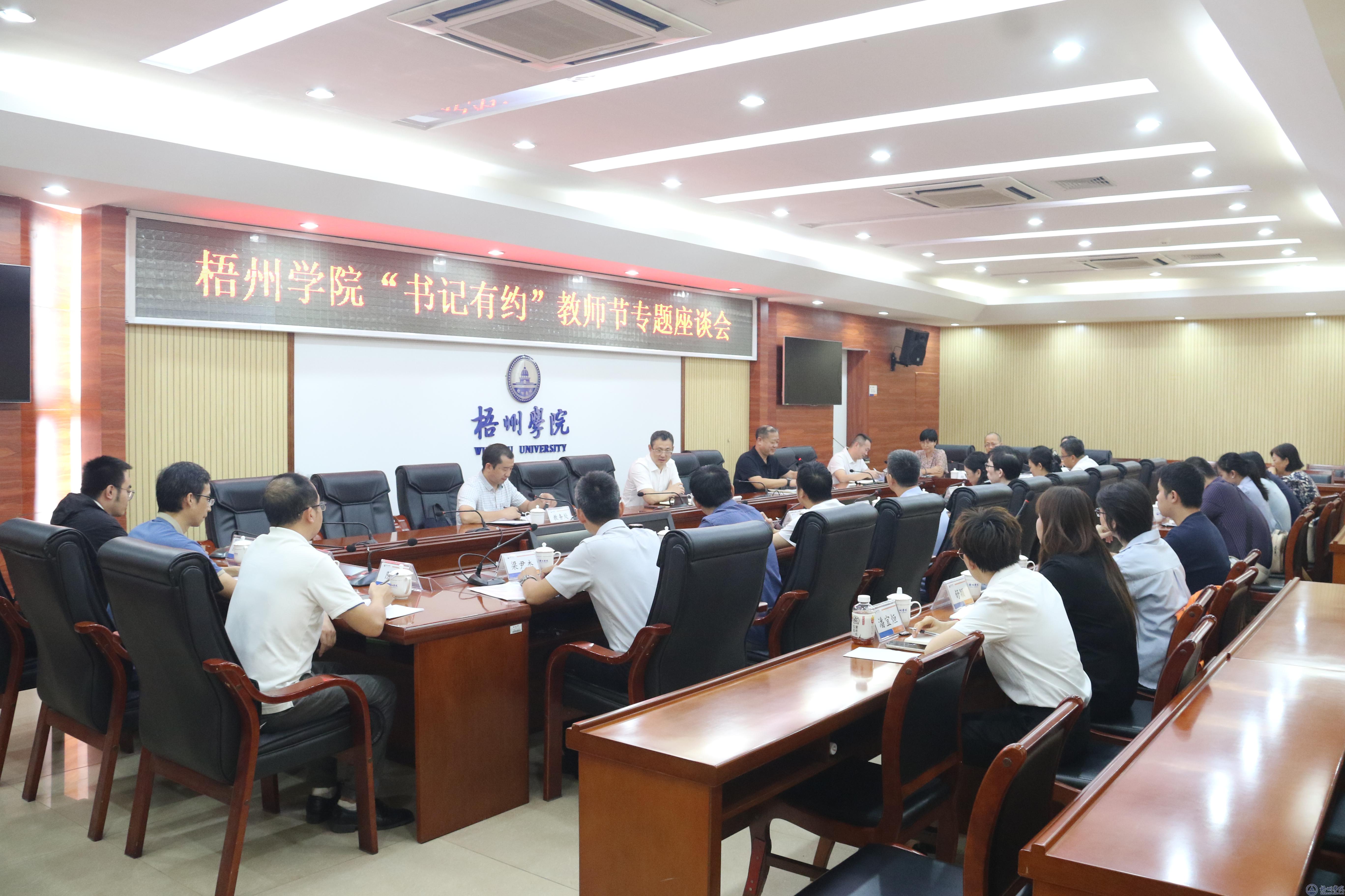 9月10日,第40个教师节当日,学校在明理楼八楼第一会议室召开梧州学院“书记有约”教师节专题座谈会。学校党委书记童晓晖出席座谈会,人事处、教务处、科研处相关负责人以及各二级学院23名教师代表参加会议。会议由人事处副处长黄海主持。