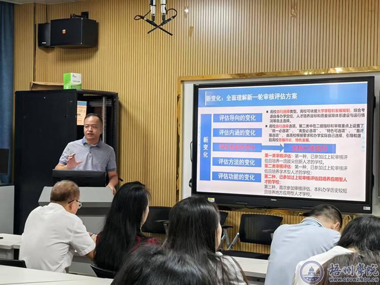 会上,分管教学副院长黄璜传达了《梧州学院本科教育教学审核评估工作实施方案》的工作要求,并带领大家学习了教学审核评估的内容,从本科教学审核评估的内涵、重要意义、审核评估的指标以及工作要求等四个方面作了解读,并对学院审核评估工作的具体安排进行介绍和部署。