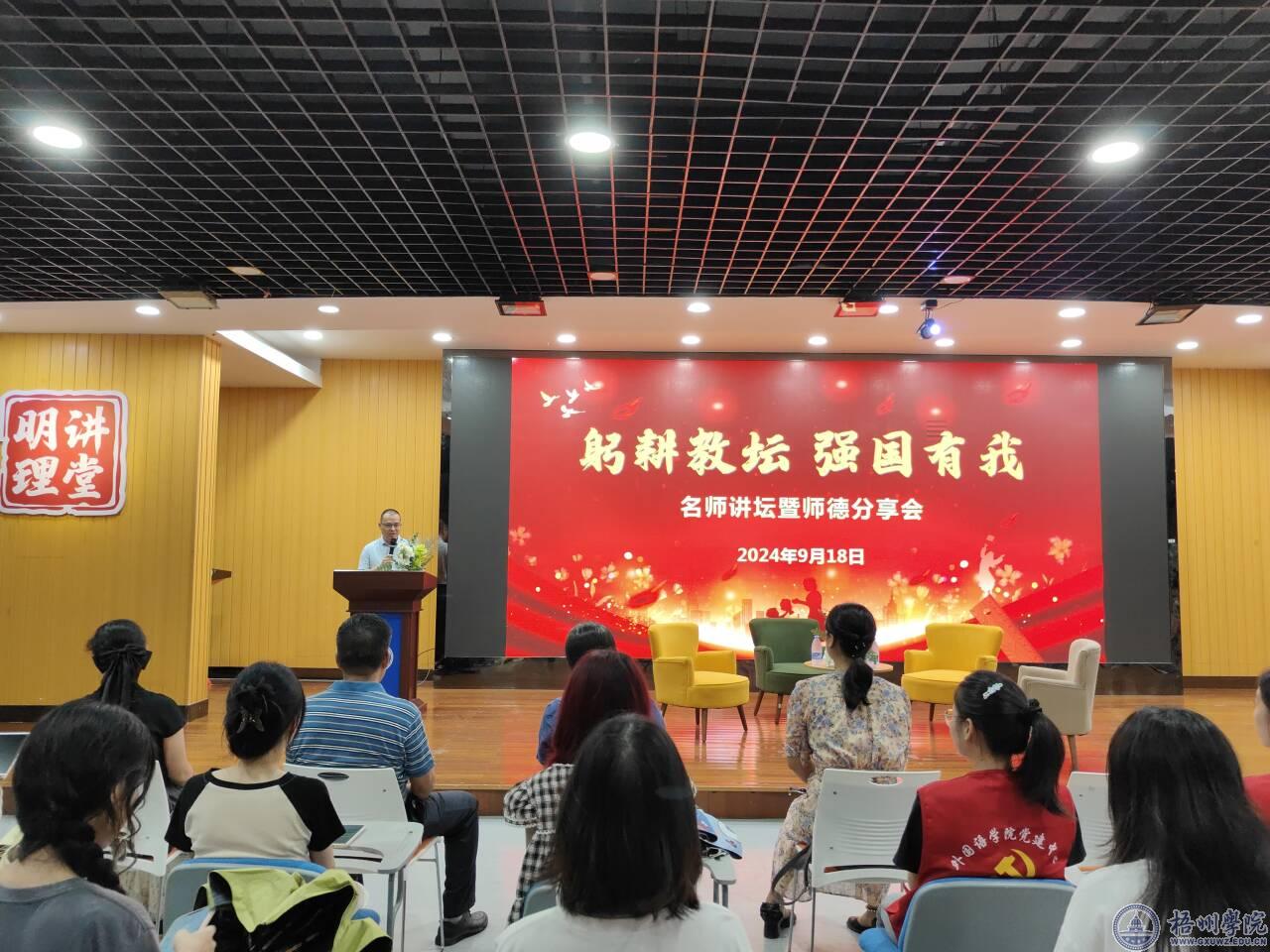 9月18日,外国语学院举办“躬耕教耘,强国有我”名师讲坛暨师德分享会。活动邀请了优秀教师代表伍靖副教授,长期在教学一线工作的教师代表陈国娟副教授、雷应秋副教授与师生分享教书育人的经验及感悟。学院班子成员、师生代表参加活动。