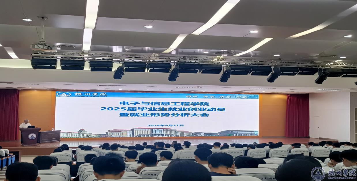 9月21日下午,电子与信息工程学院在明理楼学术报告厅举办2025届毕业生就业创业工作动员暨就业形势分析大会。学院领导、各教研室主任、2025届毕业生毕业设计指导老师、毕业班辅导员、班主任以及全体毕业生参加会议。