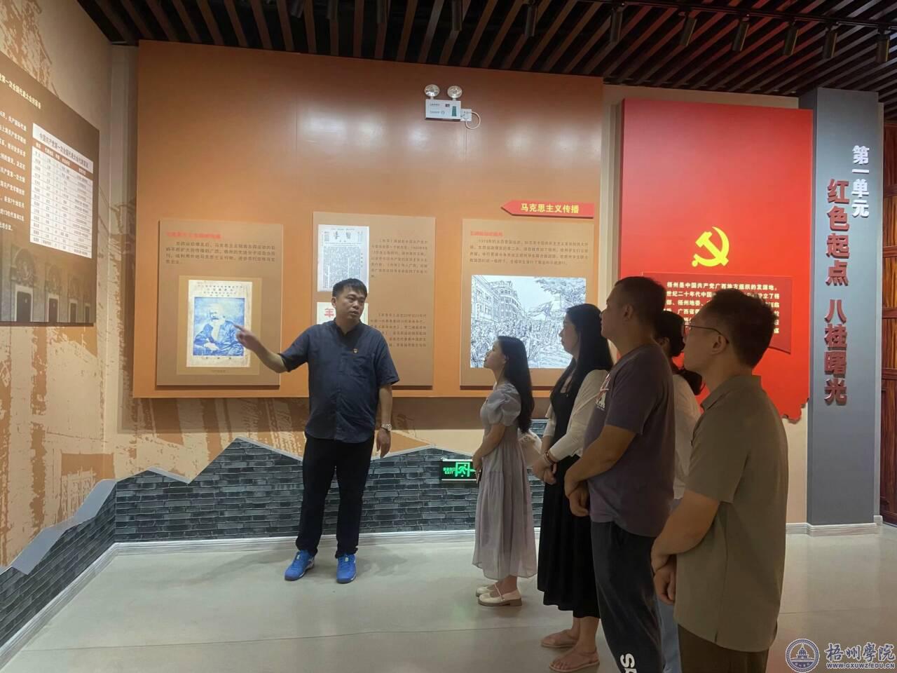 在学院党委副书记、纪委书记庄雨的带领下,参与人员有序进入陈列馆,依次参观了“十九世纪末二十世纪初的梧州”“梧州人民反帝反封建历史壮举”“中共梧州支部诞生”等主题展区。通过丰富的照片、感人的故事和珍贵的历史资料,师生们深刻感受到了梧州革命历史的波澜壮阔,领悟到了当时共产党员和共青团员为解救劳苦大众,不畏艰险、英勇奋斗、敢于牺牲的大无畏精神。