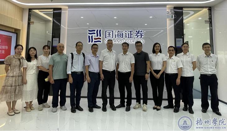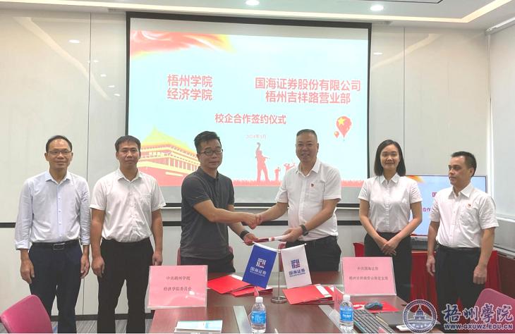 9月26日下午,经济学院与国海证券股份有限公司梧州吉祥路营业部在该营业部签订党建共建合作协议、校企合作协议。营业部支部书记、总经理林潜,营业部相关工作人员,经济学院班子成员,教师、辅导员代表参加签约仪式。