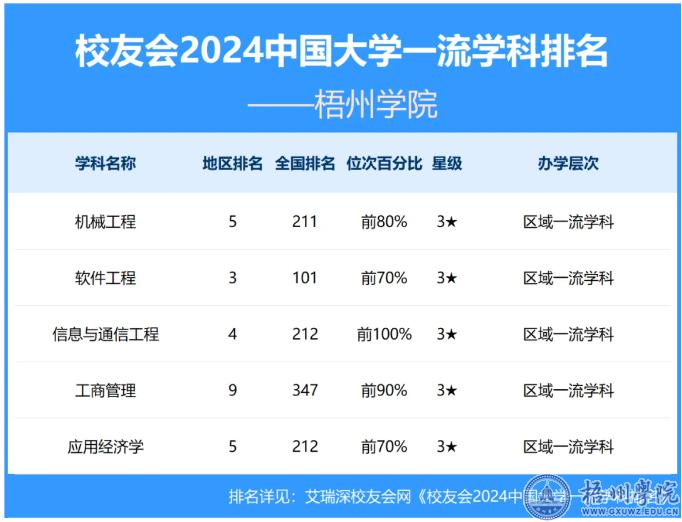 9月24日,全国第三方大学评价机构艾瑞深校友会网(Cuaa.Net)最新发布校友会2024中国大学最好学科排名和校友会2024梧州学院学科排名,我校机械工程、软件工程、信息与通信工程、工商管理、应用经济学5个学科荣登2024中国三星级学科(3★)、区域一流学科。