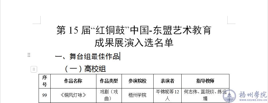 近日,自治区文化和旅游厅、自治区教育厅联合公布了第15届“红铜鼓”中国—东盟艺术教育成果展演活动入选名单,我校原创曲艺作品《铜凤灯咏》获舞台组最佳作品,并于11月6日受邀赴桂林参加现场展演。