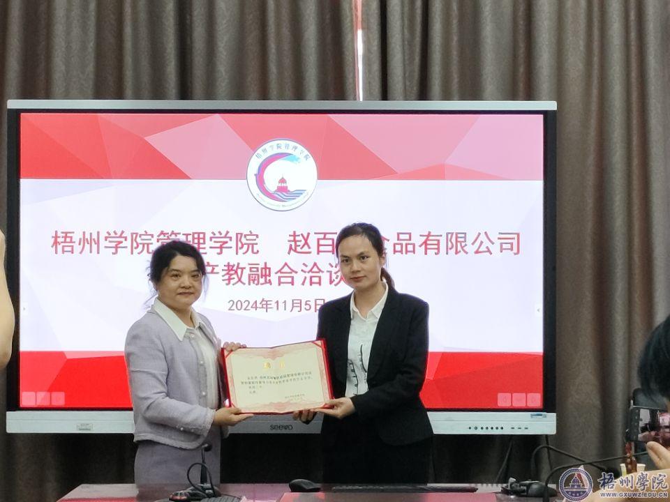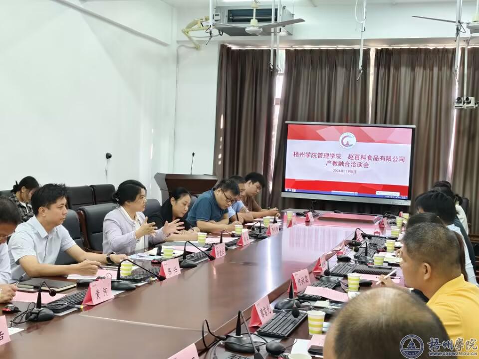 为促进校企合作、推动高质量人才培养,11月5日,管理学院在实验楼三楼国际案例分析室与赵百科食品有限公司召开产教融合洽谈会。学院领导、师生代表及赵百科食品有限公司企业家参加了会议。