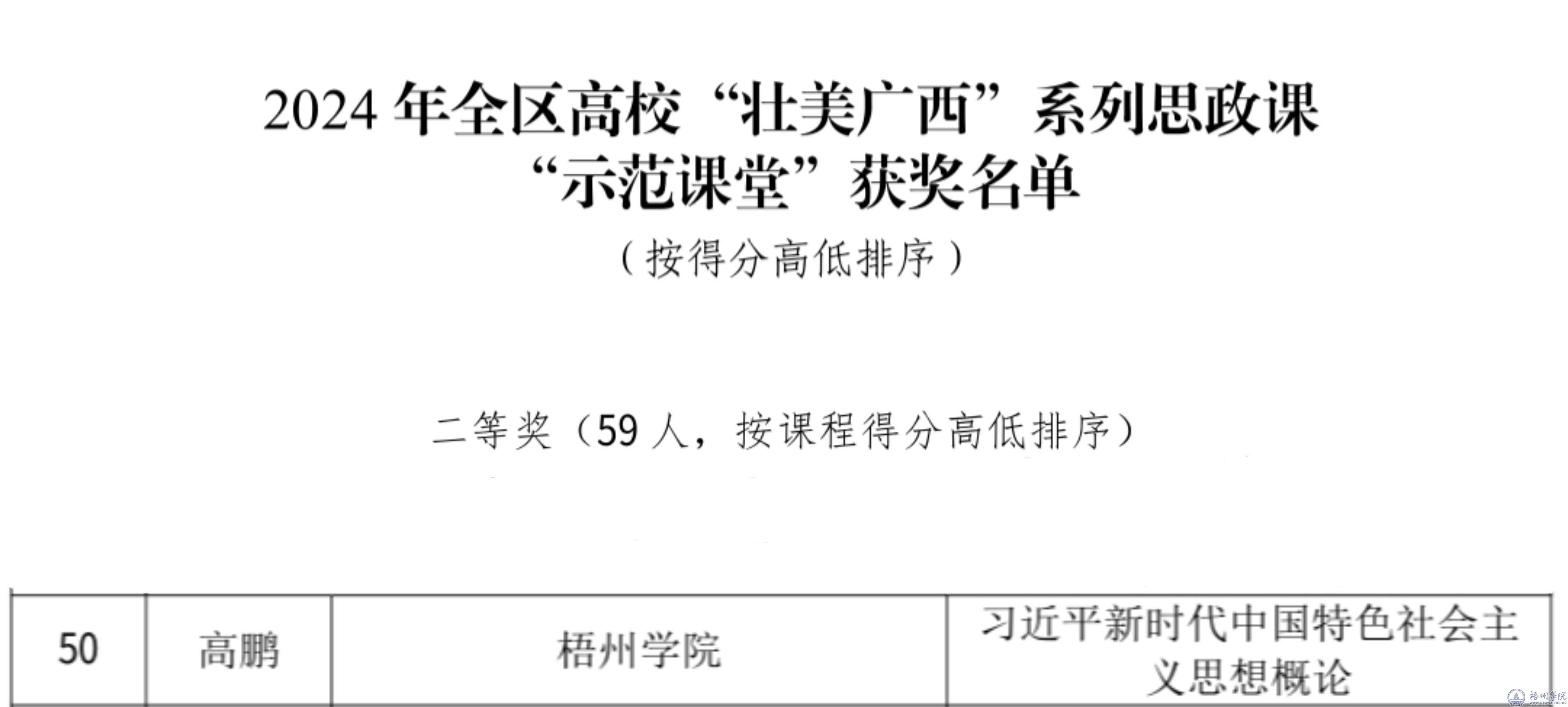 近日,2024年广西高校思想政治理论课教师教学基本功比赛暨“精彩一课”中,我校马克思主义学院高鹏老师获2024年广西高校思想政治理论课教师教学基本功比赛暨“精彩一课”二等奖。