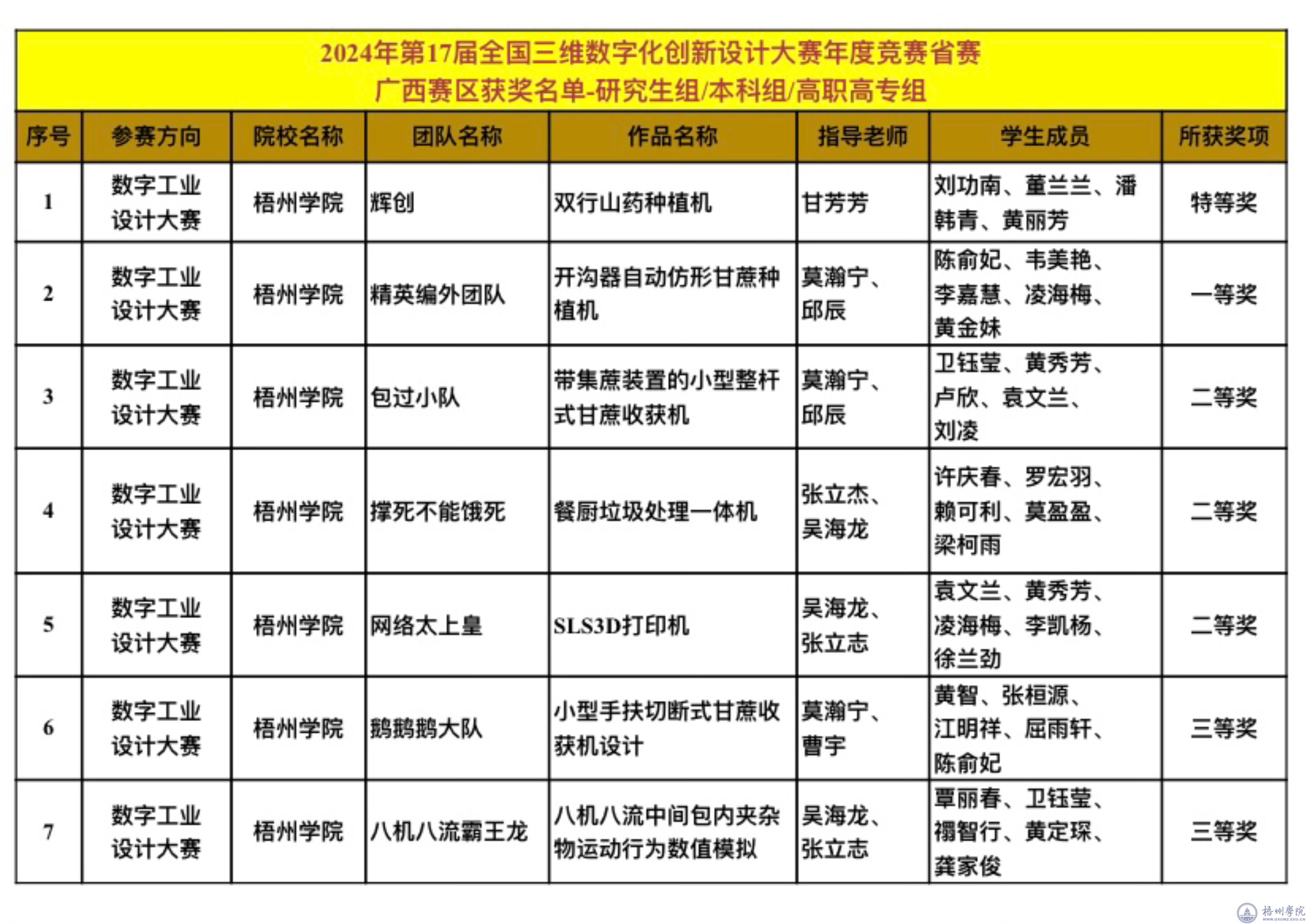 近日,2024第17届全国三维数字化创新设计大赛年度竞赛省赛广西赛区评审结果公布,我校机械与资源工程学院学生获得广西赛区本科组特等奖1项,一等奖1项,二等奖3项,三等奖2项。