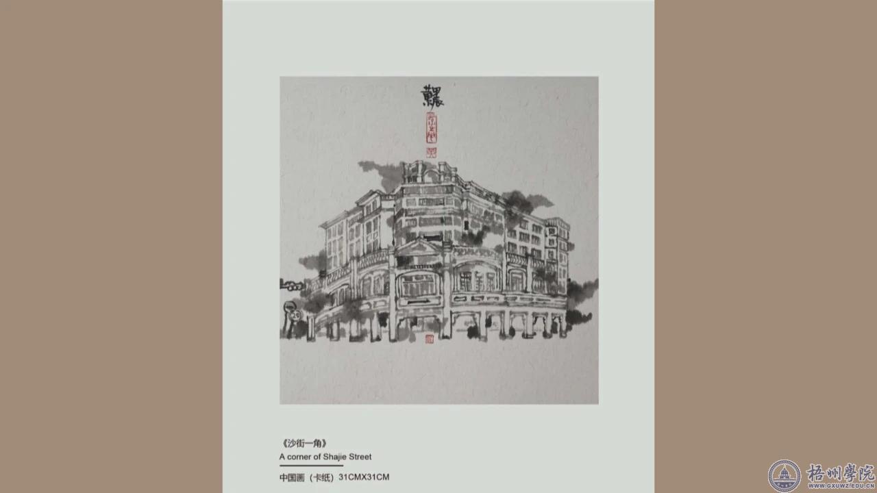 “最主要是水墨画的创作方法,在水墨画创作期间,技法上面有一些是纯粹的画法,在色彩上面主要运用了泼墨的方式,去表达骑楼的历史厚重感。”