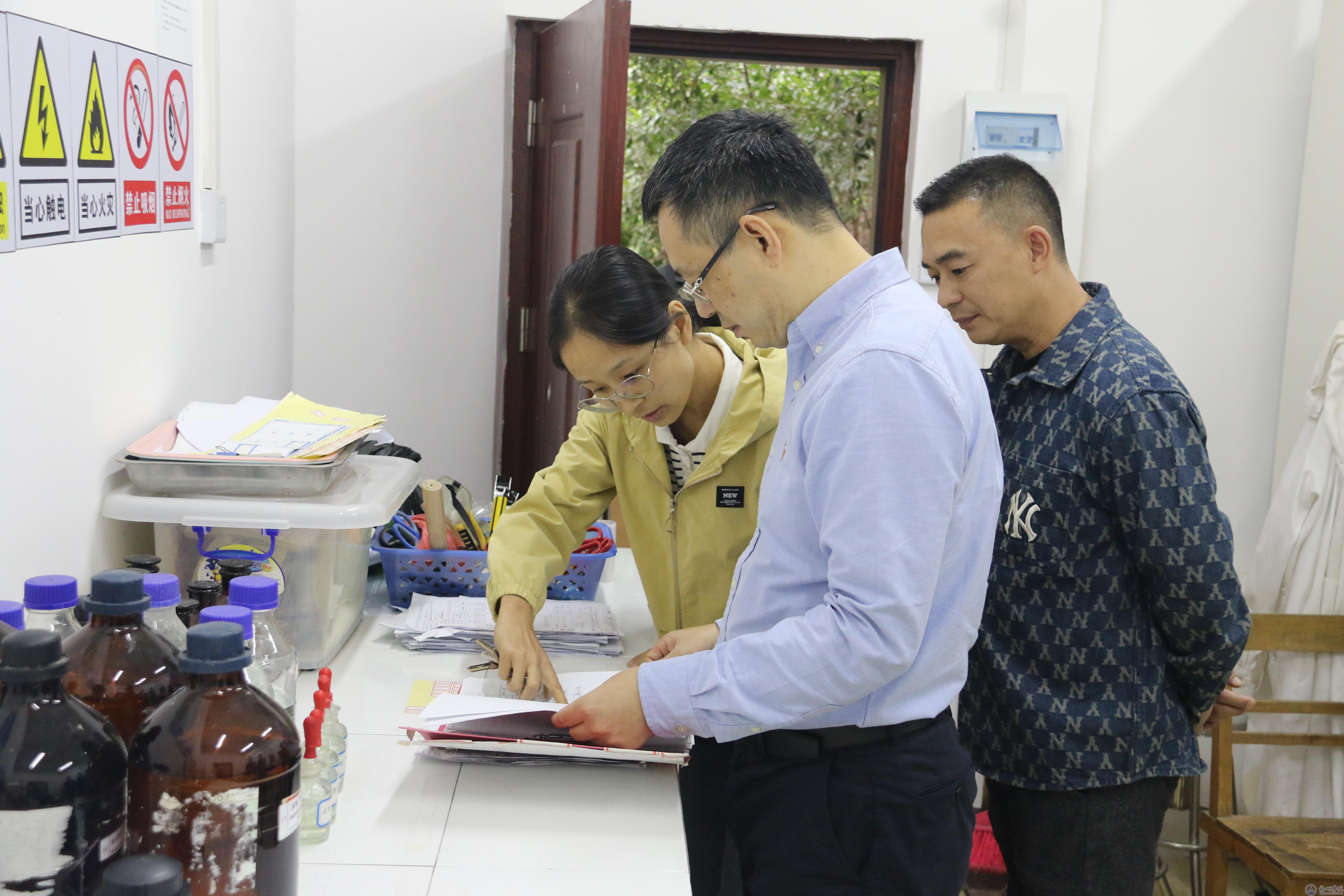 在第一教学楼实验室药品房、北区综合实训楼南楼一楼机资学院金工实验室、北楼林产化工实验室、无机分析化学实验室,童晓晖详细了解了实验设备运行、危险化学品管理、实验操作规程执行等情况,并认真核查了药品存放环境、使用记录及过期药品处理流程等,要求相关人员严格遵守实验室的管理规定,并制定和出台相关的管理制度,要高度重视实验室安全,加强师生安全教育培训,规范实验操作流程,杜绝安全事故发生。