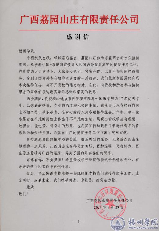 信中指出,荔园山庄作为东盟两会的永久接待酒店,承接着中国-东盟国家领导人和国内外重要宾客的接待服务工作。两会期间,我校精心选派来自管理学院与外国语学院的17名优秀学生,以饱满的热情、专业的态度和无私的奉献,在荔园山庄各接待岗位上不怕辛苦、尽职尽责,全身心的投入到各项接待服务工作中,展现出梧院学生有理想、敢担当、能吃苦、肯奋斗的形象,用实际行动践行了新时代青年的青春风采和责任担当,为荔园山庄的接待服务工作作出了突出贡献。
