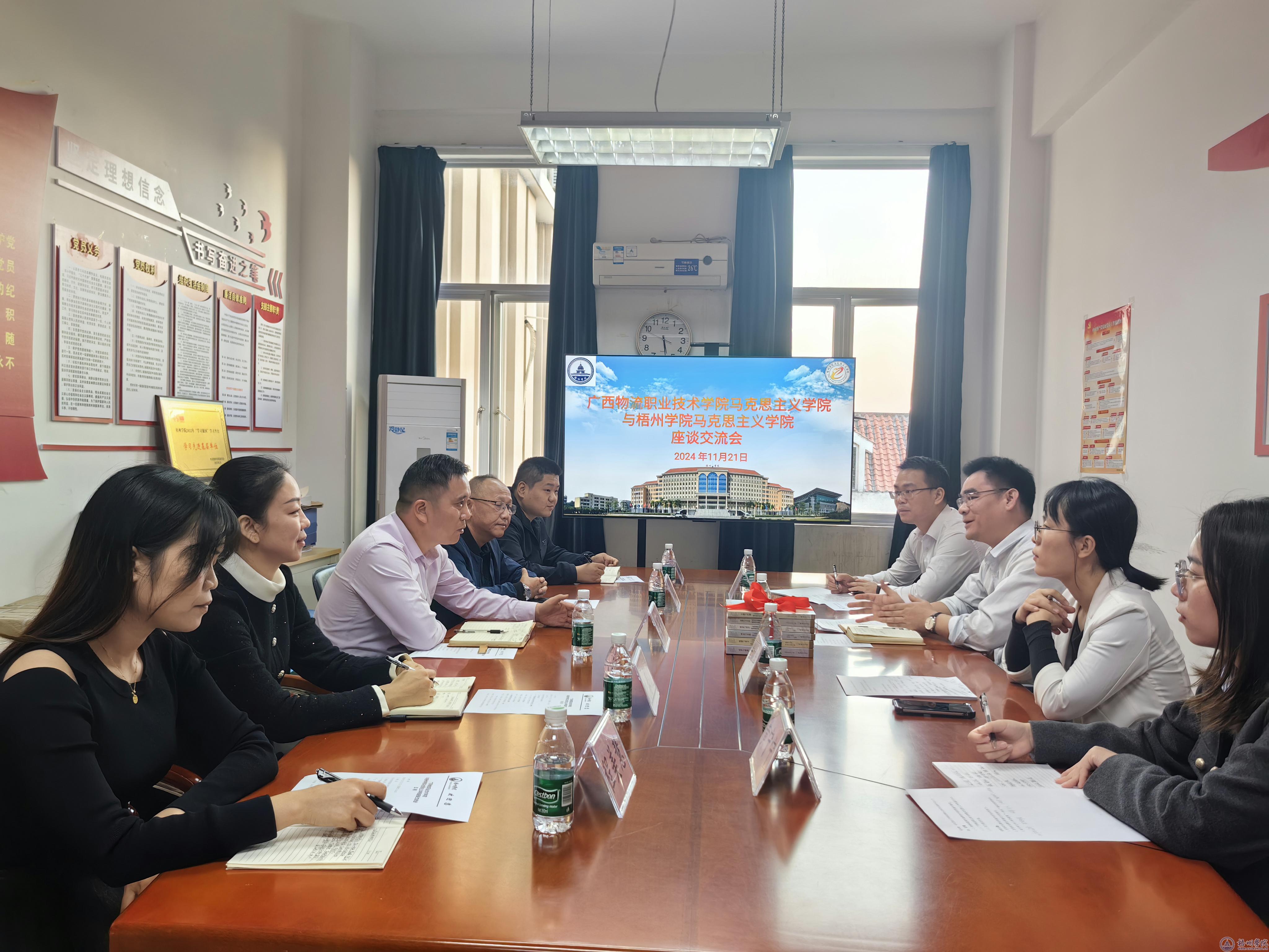 近日,广西物流职业技术学院马克思主义学院党支部书记苏凯一行到我校马克思主义学院进行调研交流,座谈会由副院长唐景成主持。