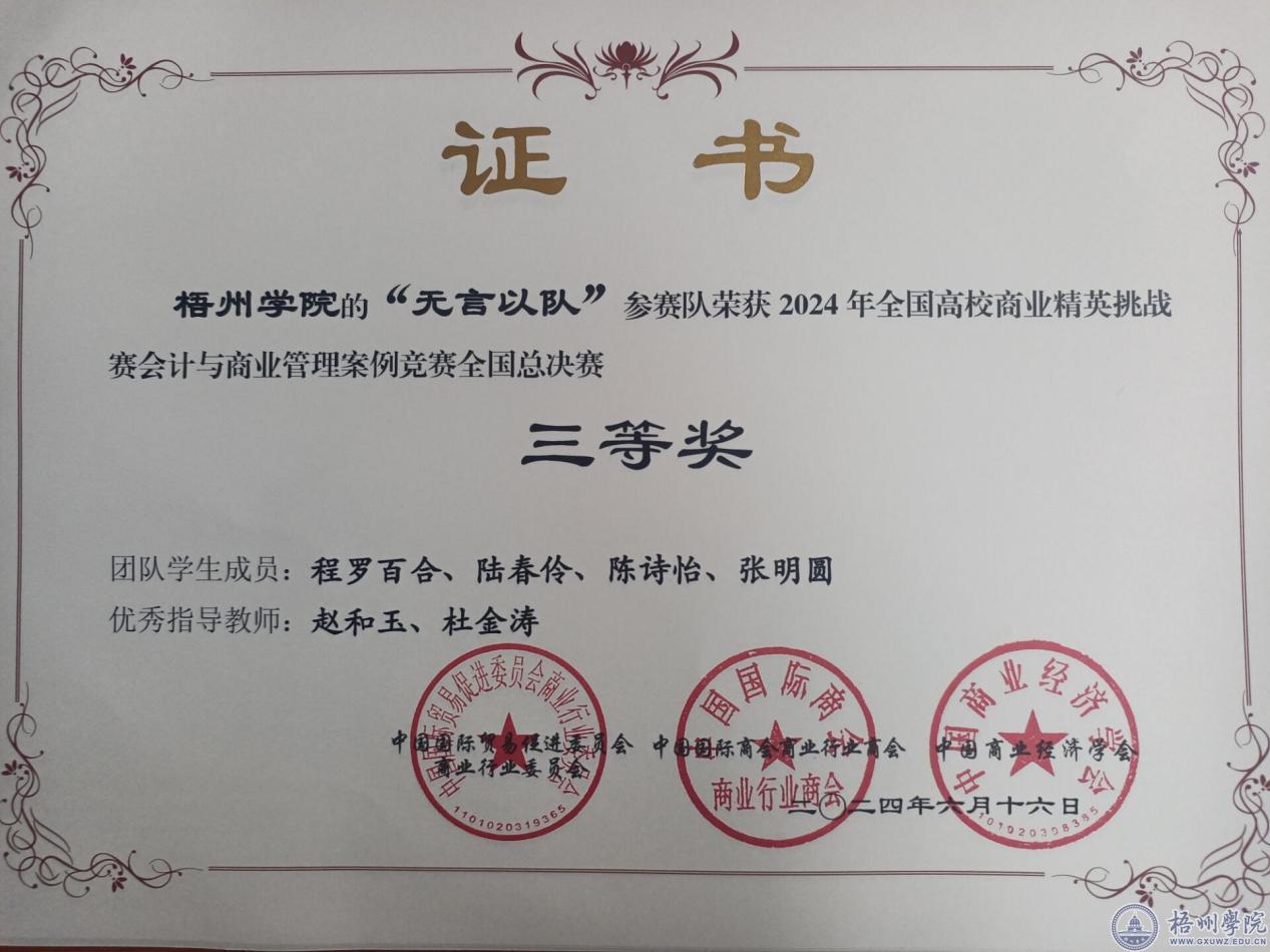 近日,由中国贸促会商业行业委员会、中国国际商会商业商业商会、中国商业经济学会共同主办的全国高校商业精英挑战赛会计与商业管理案例竞赛正式落幕。由管理学院财务管理教研室赵和玉、杜金涛两位老师指导的两支队伍(无言以队、对对队)均获得全国总决赛三等奖,参赛学生均来自管理学院2022级财务管理专业。