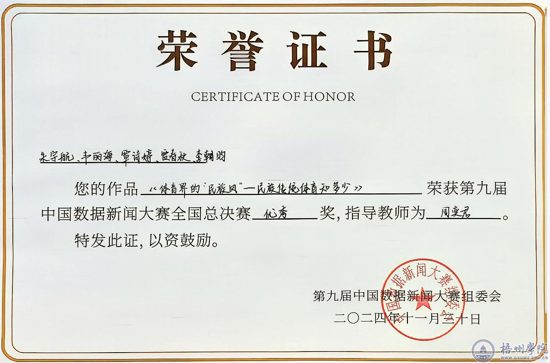 11月30日上午,第九届中国数据新闻大赛总决赛于华中科技大学盛大启幕。在紧张激烈的团队答辩与严谨专业的专家评审环节过后,我校文学与传媒学院学生朱宇航团队的作品《体育界的“民族风”——民族传统体育运动知多少》脱颖而出,荣获第九届中国数据新闻大赛全国总决赛优秀奖。