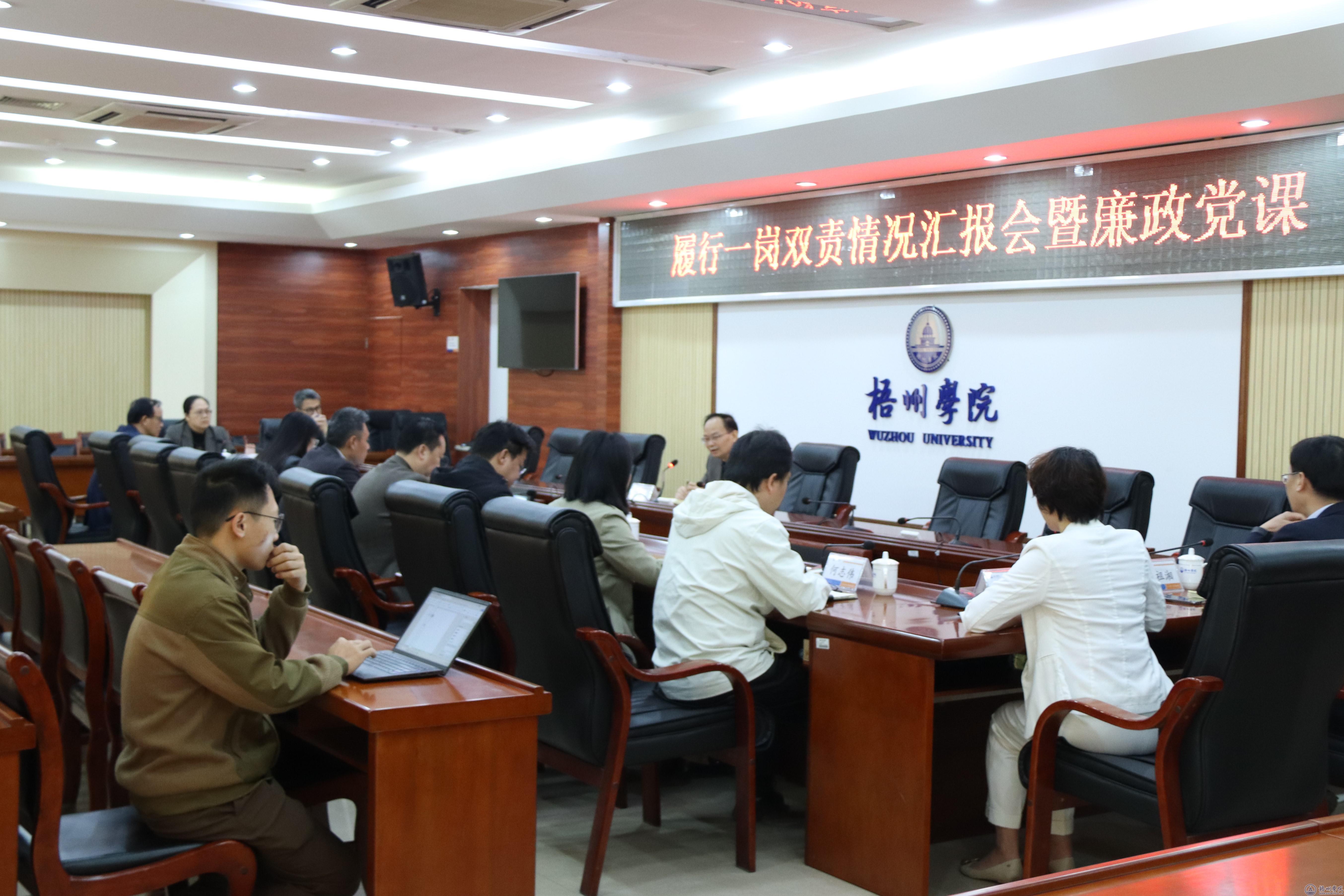 12月5日上午,学校党委副书记梁业华召集分管部门召开履行一岗双责情况汇报会暨廉政党课,组织部、宣传部、统战部、学生工作部、机关党委、校工会、校团委等部门全体班子成员参加会议。