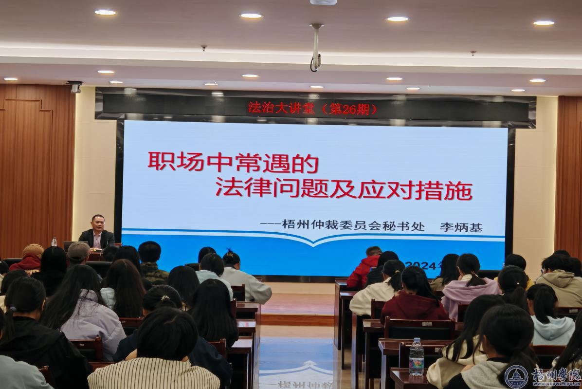 11月30日晚,法学院法治大讲堂第26期在明科楼101报告厅举办。本次大讲堂特邀梧州仲裁委员会秘书长李炳基作为主讲嘉宾,法学院院长骆庆国出席并致辞,2024级全体学生参加了此次活动。