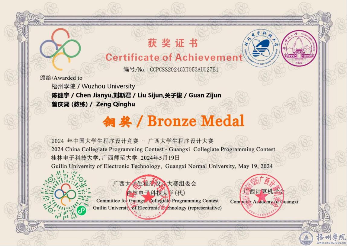 近日,2024第七届广西大学生程序设计大赛在广西桂林市广西师范大学落下帷幕,大数据与软件工程学院的参赛队伍表现出色,获得省级三等奖1项。