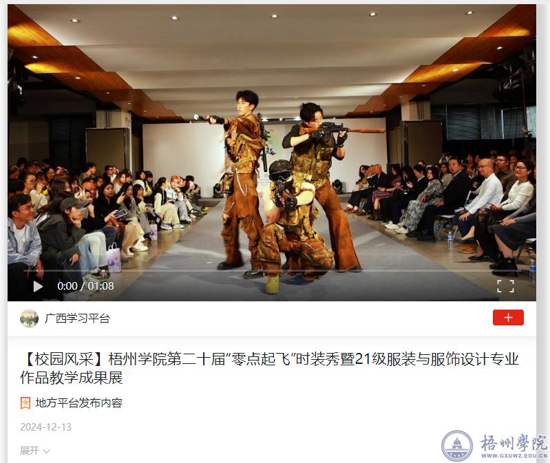 近日,我校原创视频作品《梧州学院第二十届“零点起飞”时装秀暨21级服装与服饰设计专业作品教学成果展》被“学习强国”平台转载刊播。该视频由党委宣传部出品,马庆斌、张钰昆拍摄剪辑。梧州学院第二十届“零点起飞”时装秀暨21级服装与服饰设计专业作品教学成果展举办。本届时装秀共出展了57位21级服装与服饰设计专业应届毕业生的170多套不同风格不同款式的服装作品。作品展分为《启程》《新视界》两个板块,分别展示创意休闲类设计作品与礼服类设计作品。