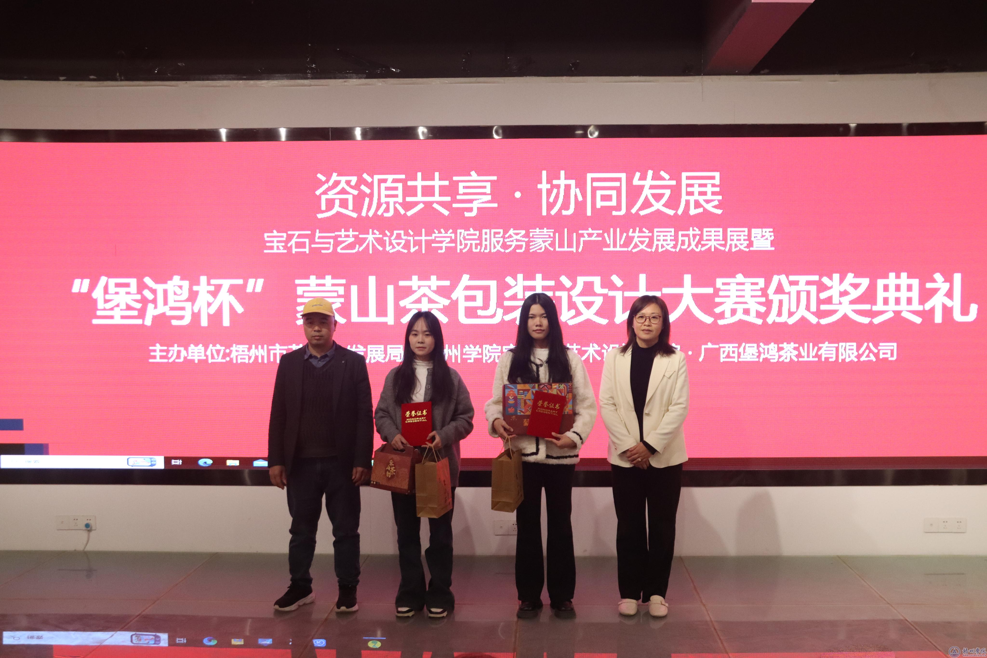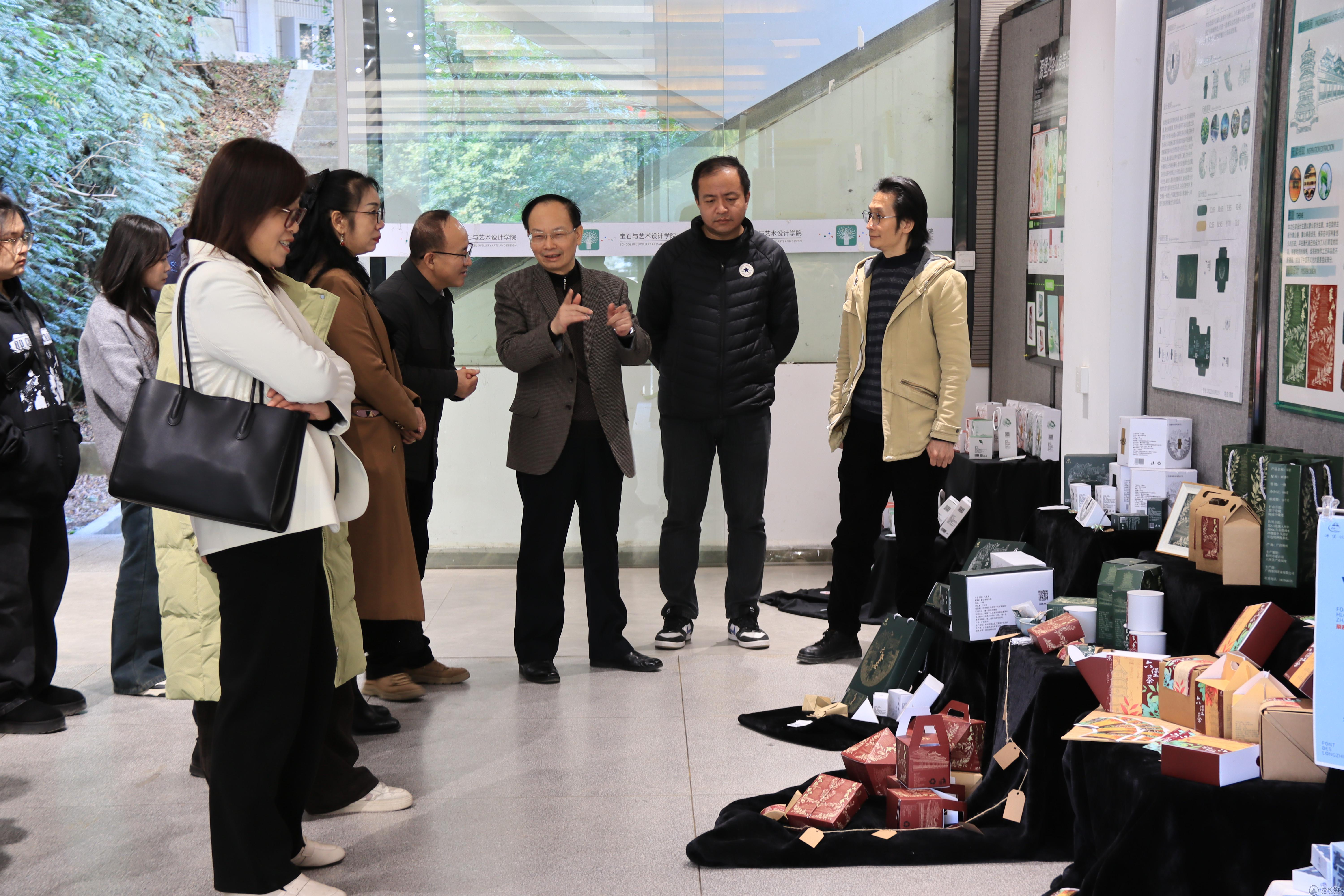 12月19日,“资源共享•协同发展—宝石与艺术设计学院服务蒙山产业发展成果展暨‘堡鸿杯’蒙山茶包装设计大赛颁奖典礼”在宝石与艺术设计学院多功能展厅举行,学校党委副书记梁业华出席活动并观看了学生作品展览。梧州市茶产业发展服务中心主任于翠平,有关茶企负责人,宝石与艺术设计学院师生代表参加活动。