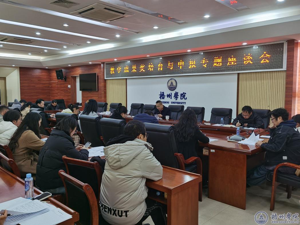 讲座结束后,尹国俊教授与学校2024年申报校级教学成果奖的团队负责人在明理楼八楼第一会议室继续进行座谈会,就教学成果的培育、凝练和申报过程中遇到的问题进行了深入的讨论与交流。