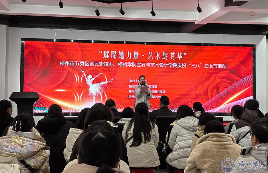 为庆祝第115个国际妇女节,3月6日,宝石与艺术设计学院与万秀区富民街道共同举办了主题为“璀璨她力量·艺术绽芳华”的庆祝活动。梧州市万秀区委常委、宣传部部长欧广明,富民街道党工委副书记梁嘉慧,宝石与艺术设计学院党委书记钟海明、副书记韦天峰等领导出席活动。活动吸引了120多名来自梧州市万秀区富民街道办及学院的女性代表共同参与。