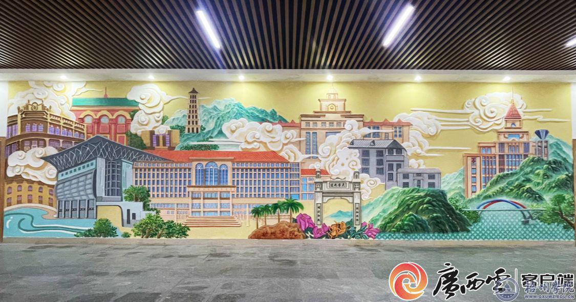 该壁画长12.6米、高3.8米,由梧州学院党委宣传部策划,宝石与艺术设计学院教师黄尔、杨杰设计,校友裴一凡及其团队历时20多天制作完成。壁画以1928年广西大学在梧州办学为起点,运用 “平行蒙太奇” 手法,按照1:16.7 的比例,对设计稿进行还原,融入各个时期梧州学院的标志性建筑以及梧州的地域文化元素,将校史生动“刻” 在墙面上,赋予其鲜活的立体生命力。