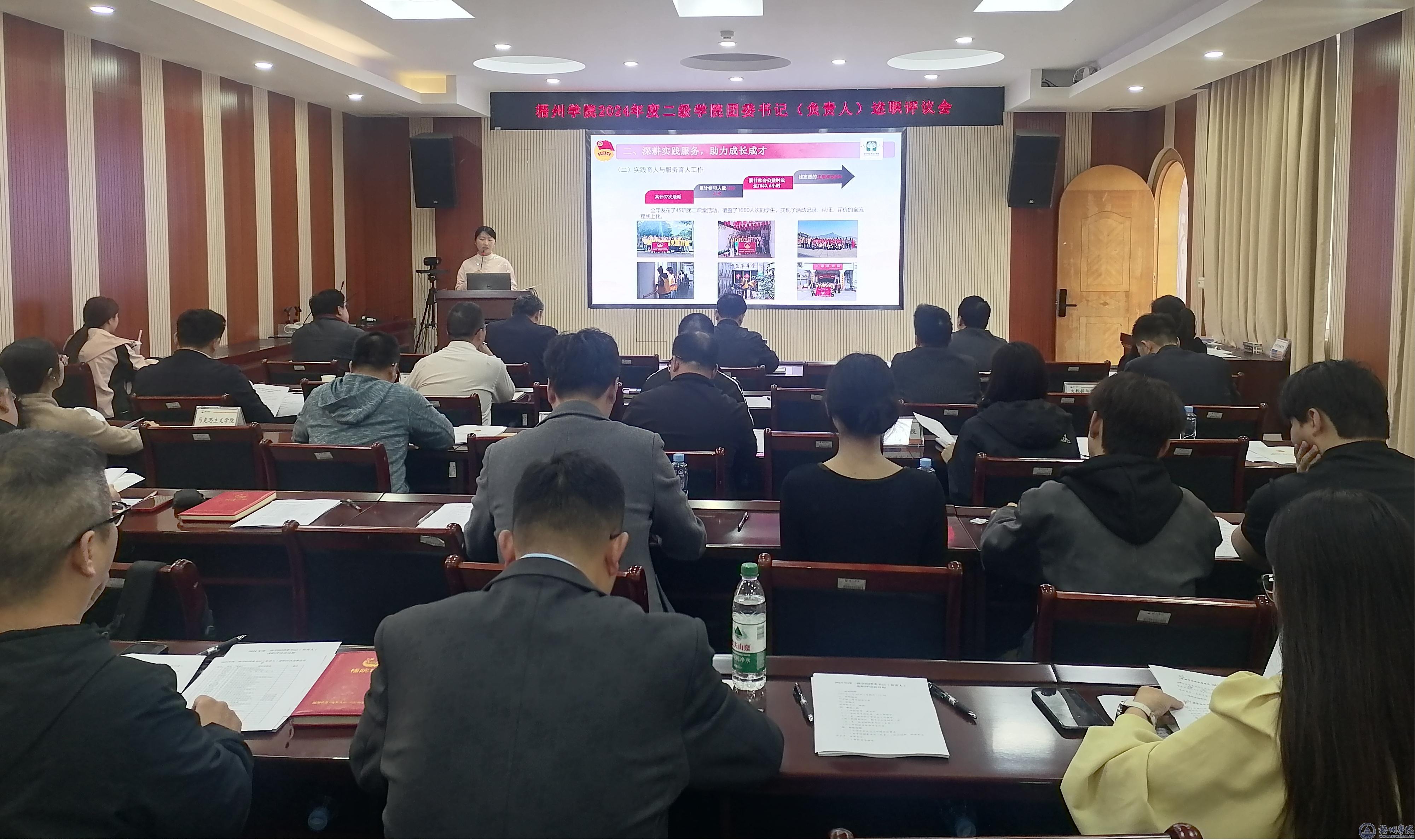 3月20日下午,学校在明理楼七楼视频会议室召开2024年度二级学院团委书记(负责人)述职评议会。学校党委副书记梁业华出席会议。党委组织部、学生工作部、校团委等相关部门主要负责人,各二级学院党委副书记、团委书记(负责人),校团委老师、青年学生代表参加会议。