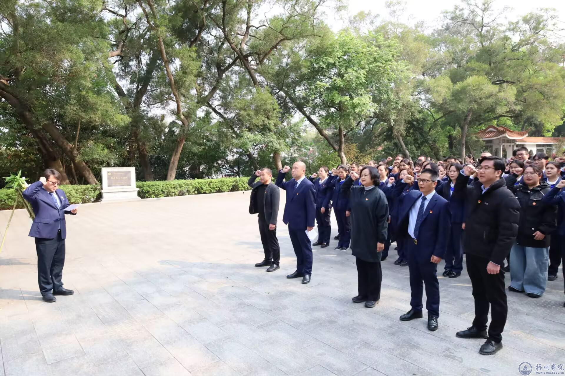 4月3日上午,在清明节来临之际,财务处党支部党员、部分员工代表与广西北部湾银行梧州分行全体党员、共青团员以及员工代表,怀着崇敬之情齐聚珠山公园革命烈士纪念碑前,联合开展了以“清明时节祭先烈 缅怀忠魂励初心”为主题的党日活动。大家以庄重肃穆的仪式,向革命先烈致以最崇高的敬意,在烈士纪念碑前重温入党誓词。