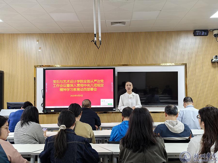 近日,宝石与艺术设计学院在明理楼M-303召开2025年全面从严治党工作会议。会议深入学习全区2025年教育系统全面从严治党工作会议、学校2025年全面从严治党工作会议精神,总结学院2024年全面从严治党工作取得的成绩。学院班子成员,全体党员参加了会议。