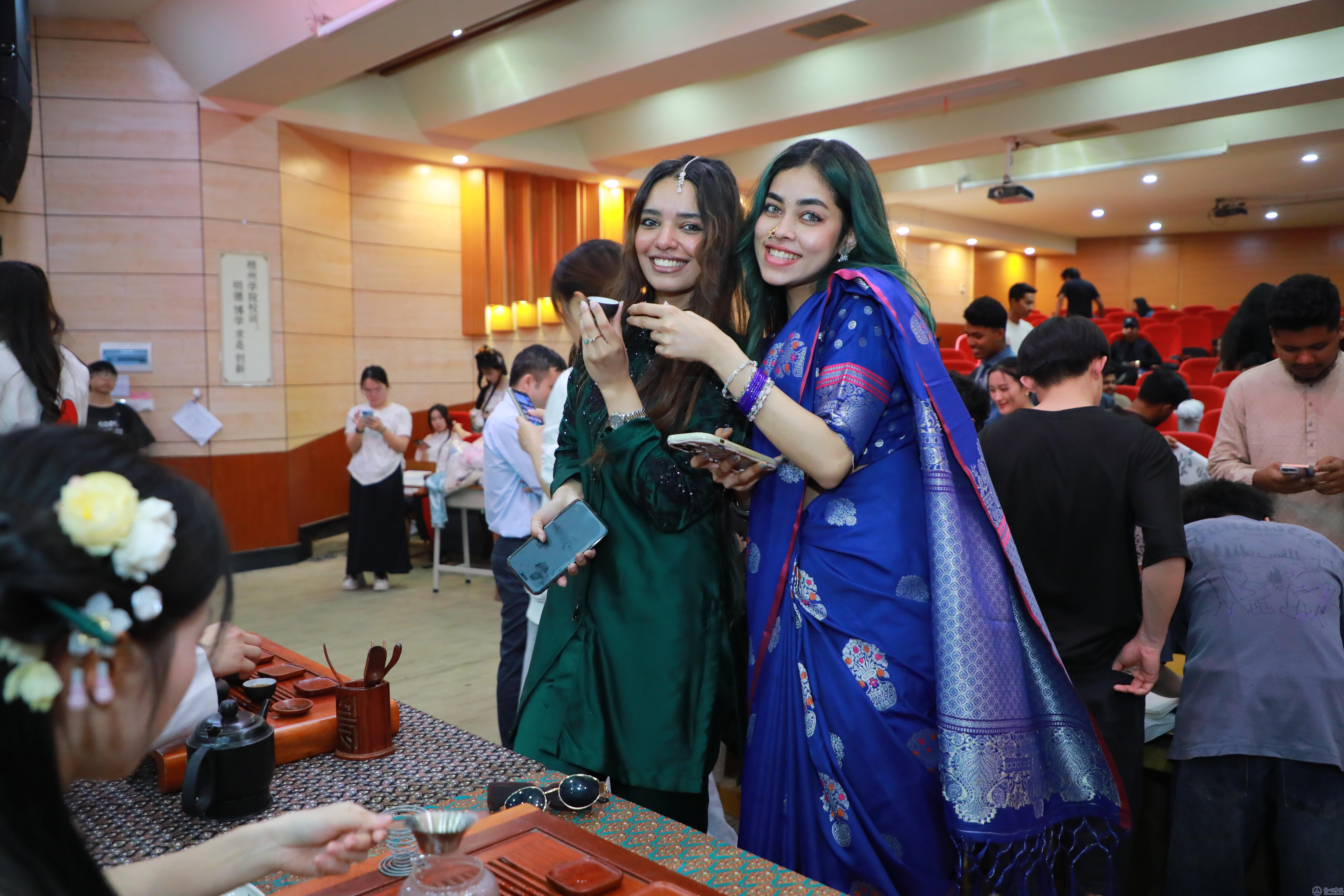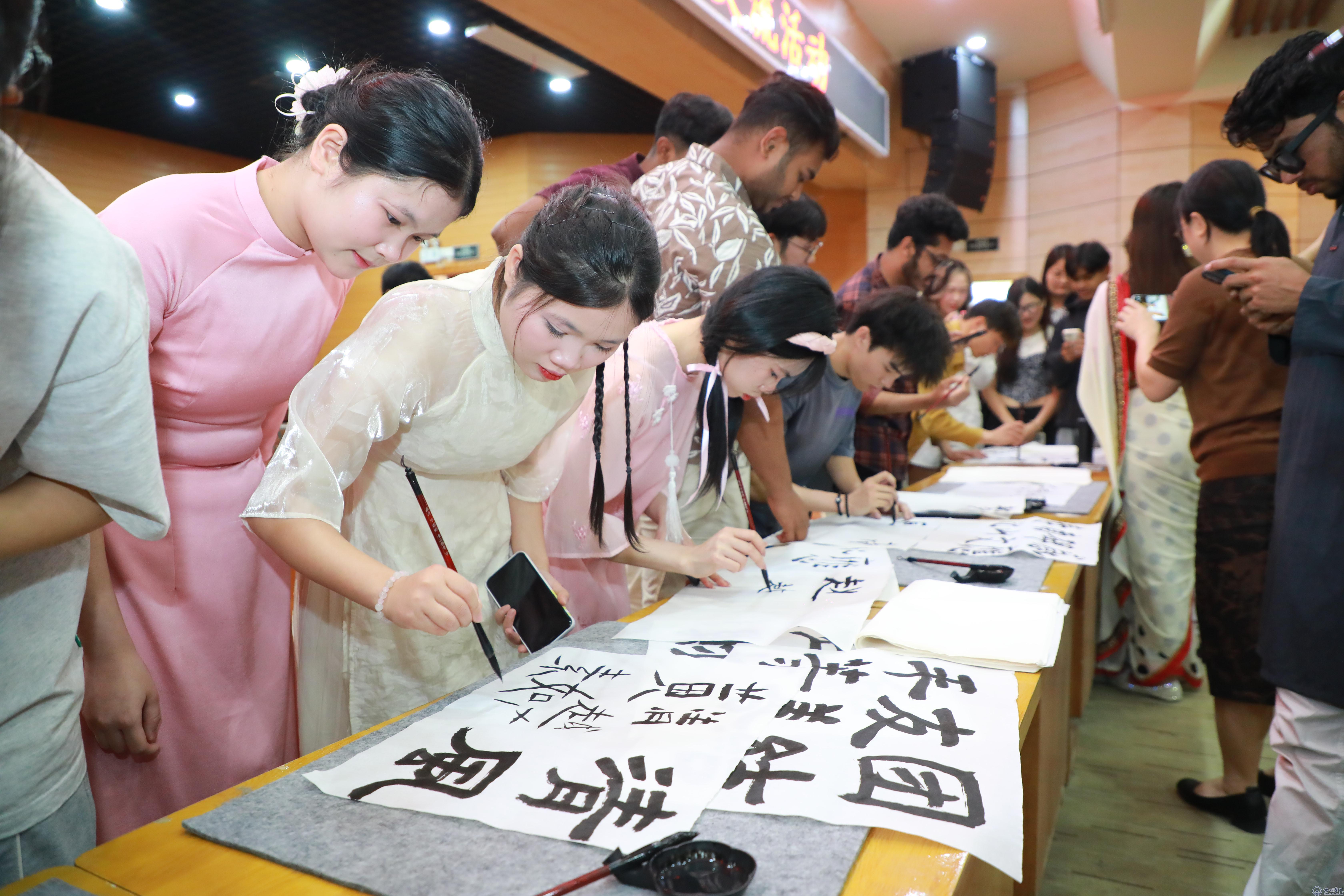 民俗文化体验环节同样亮点十足。中国学生的茶艺表演,举手投足间尽显优雅,展现了茶的美学与哲学;书法展示中,笔墨飞舞,展现着中国传统文化的博大精深。留学生们在一旁认真观看,不时发出赞叹。
