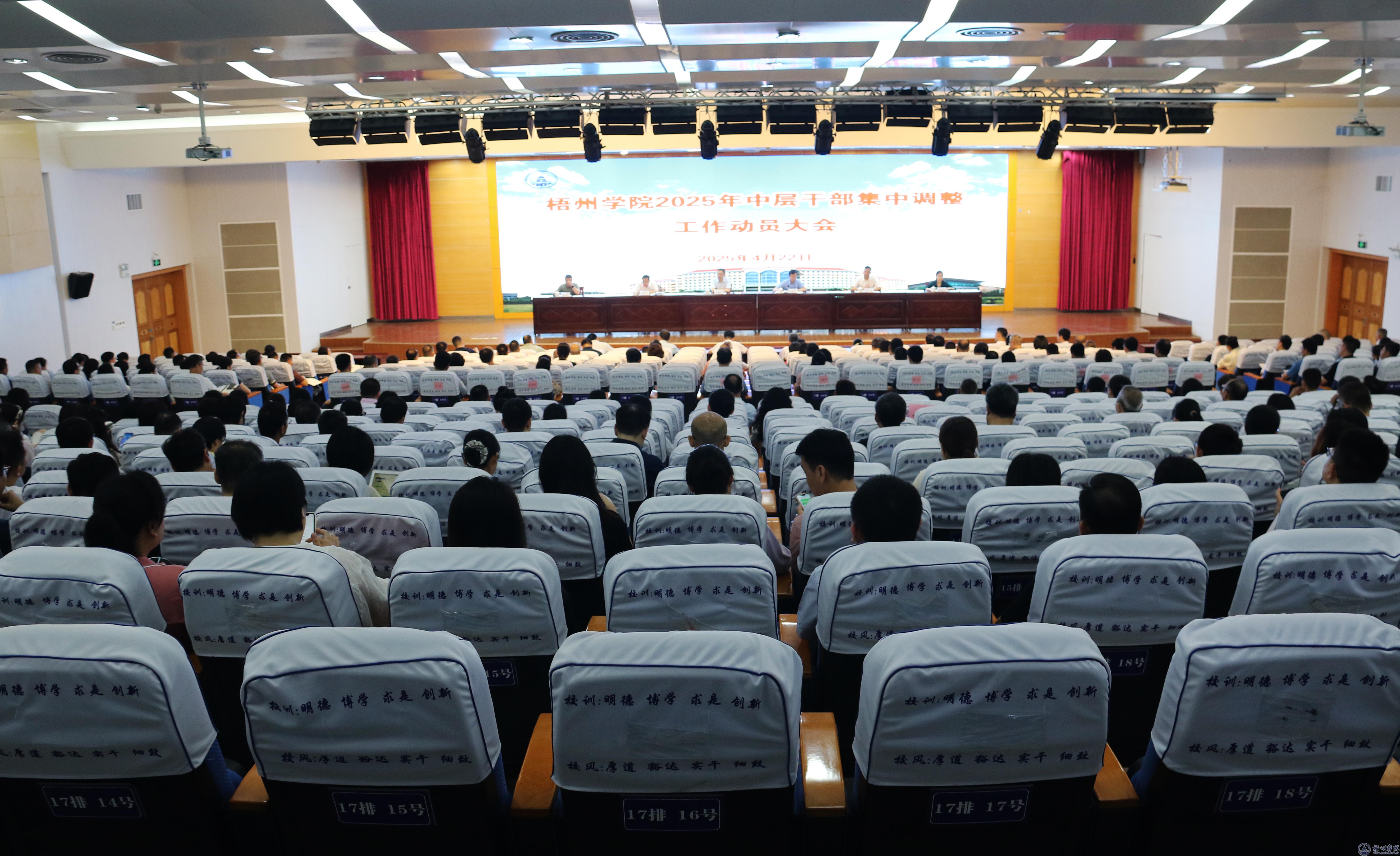 4月22日,学校在明理楼一楼学术报告厅召开2025年中层干部集中调整工作动员大会,学校领导童晓晖、麻新纯、梁业华、范生汝、覃雄彪、莫晨宇出席会议,全体科级及以上干部、具有中级职称以上人员参加会议。会议由校长麻新纯主持。