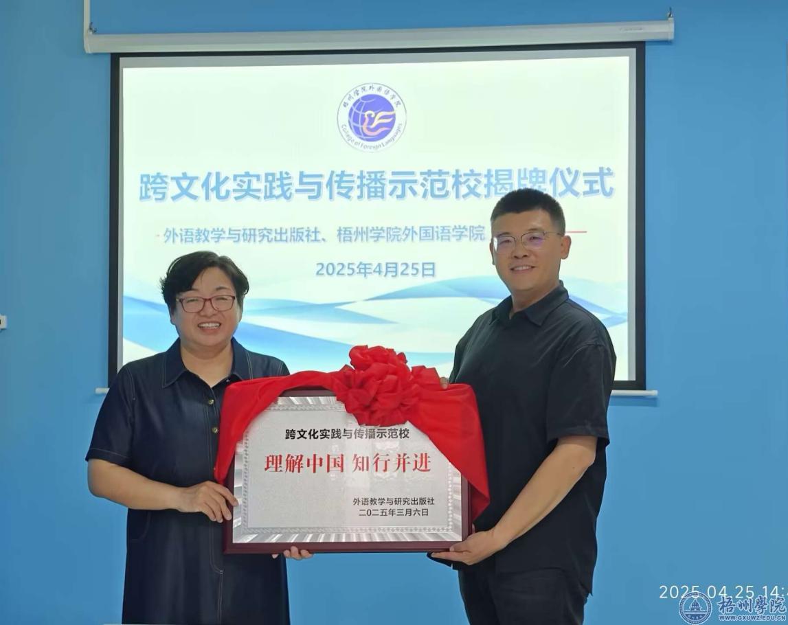 4月25日,外国语学院、外语教学与研究出版社在北区实训楼会议室举行跨文化实践与传播示范校揭牌仪式。外国语学院院长宋银秋、副院长晏劲松,外语教学与研究出版社代表李峰出席揭牌仪式。