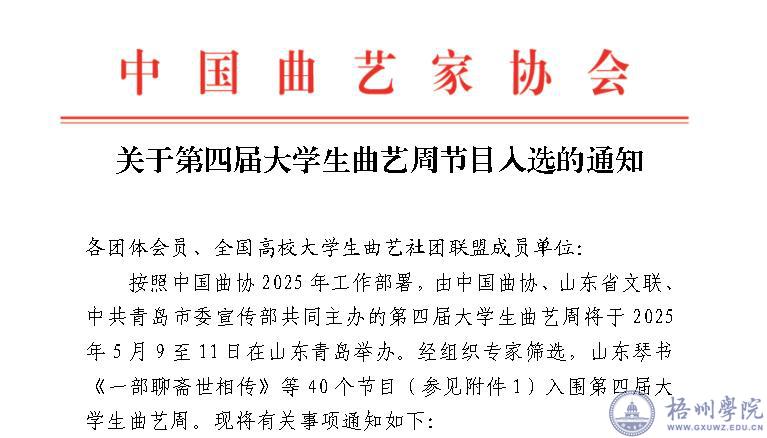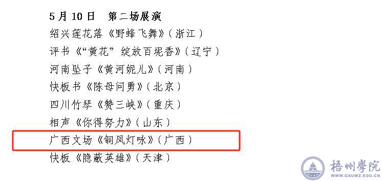 近日,中国曲艺家协会公布第四届大学生曲艺周节目入选名单,我校原创广西文场《铜凤灯咏》成功入选。该节目将于2025年5月9日至11日在山东青岛登台亮相。