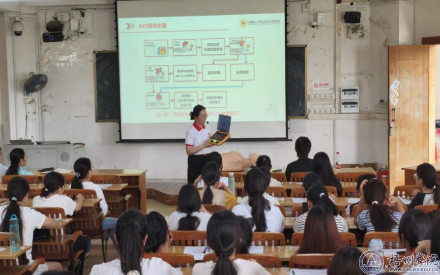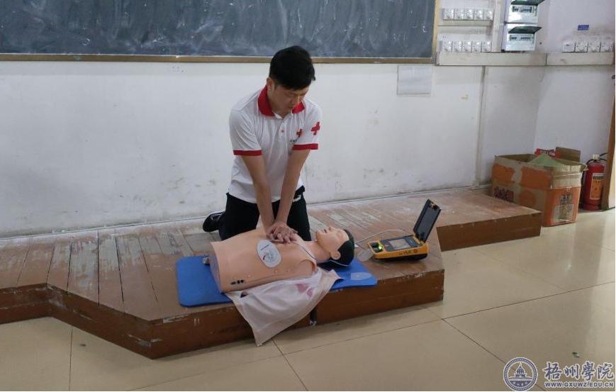 活动分为三个环节。首先,梧州市红十字会麦青老师讲授应急救护理论知识。随后,同学们参加线上理论考试,合格后继续参加实操教学及现场考核。