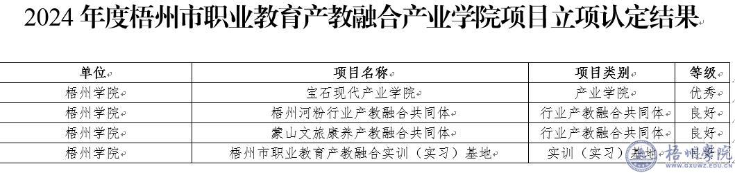 近日,梧州市教育局、梧州市发展和改革委员会、梧州市科学技术局、梧州市工业和信息化局、梧州市人力资源和社会保障局和梧州市茶产业发展局发布了《关于公布2024年度梧州市职业教育产教融合产业学院等项目立项认定结果的通知》,我校宝石现代产业学院被认定为优秀建设等级,牵头建设的梧州河粉行业产教融合共同体、蒙山文旅康养产教融合共同体和梧州市职业教育产教融合实训(实习)基地获评良好建设等级。