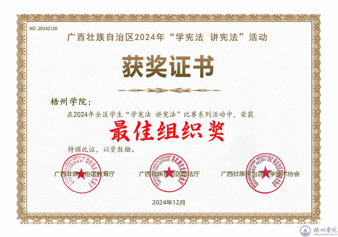 近日,由自治区教育厅、自治区司法厅、自治区科协联合公布的《2024年全区学生“学宪法 讲宪法”系列活动获奖名单的通知》文件中,我校法学院参赛学生在高校组征文活动获得三等奖7项、优秀奖5项,梧州学院荣获最佳组织奖。