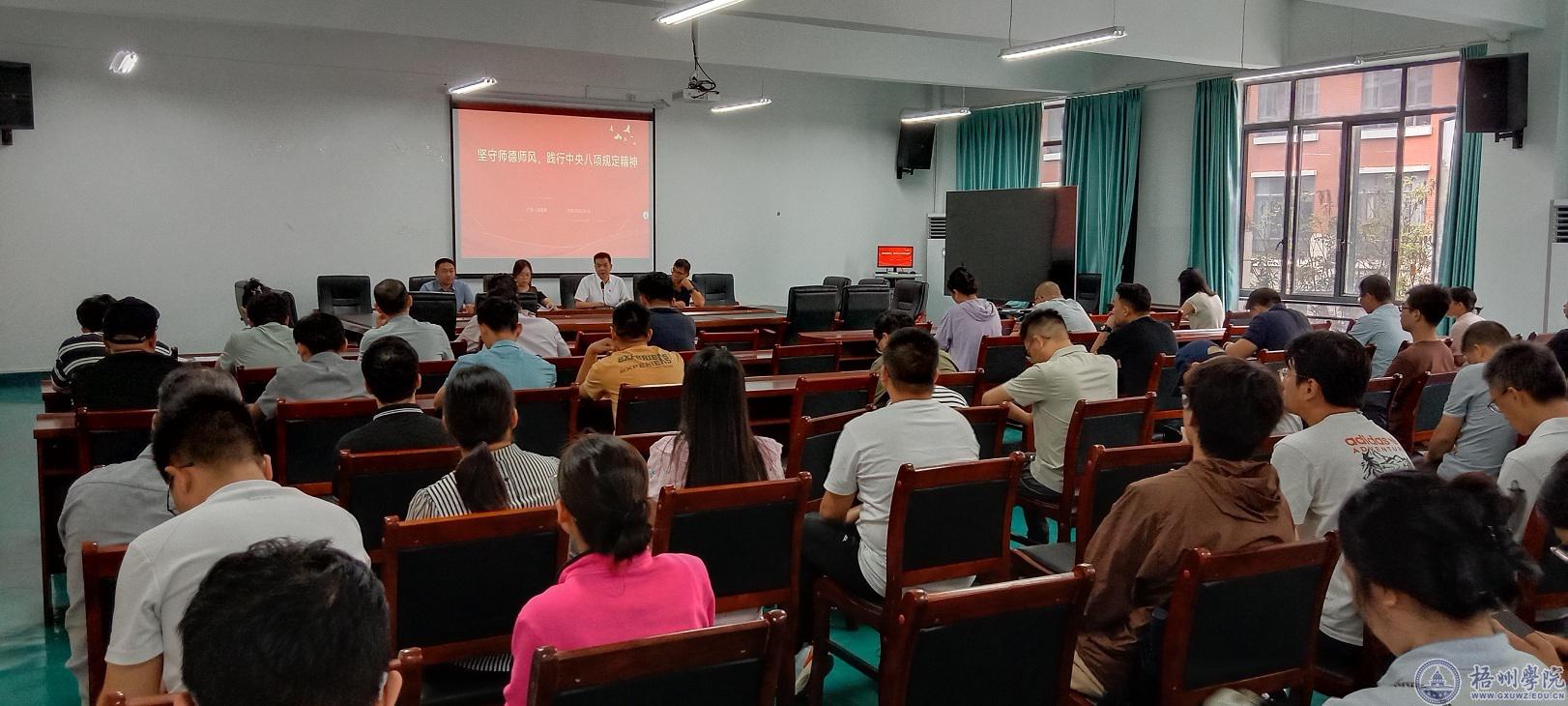 学院党委书记陈春潮传达了学校深入贯彻中央八项规定精神学习教育工作推进会会议精神,结合高校领域违反中央八项规定精神典型案例以及《新时代高校教师职业行为十项准则》《进一步加强和改进新时代师德师风建设的实施意见》和学校近期下发的有关师德师风相关文件做了《坚守师德师风,践行中央八项规定精神》专题辅导报告。