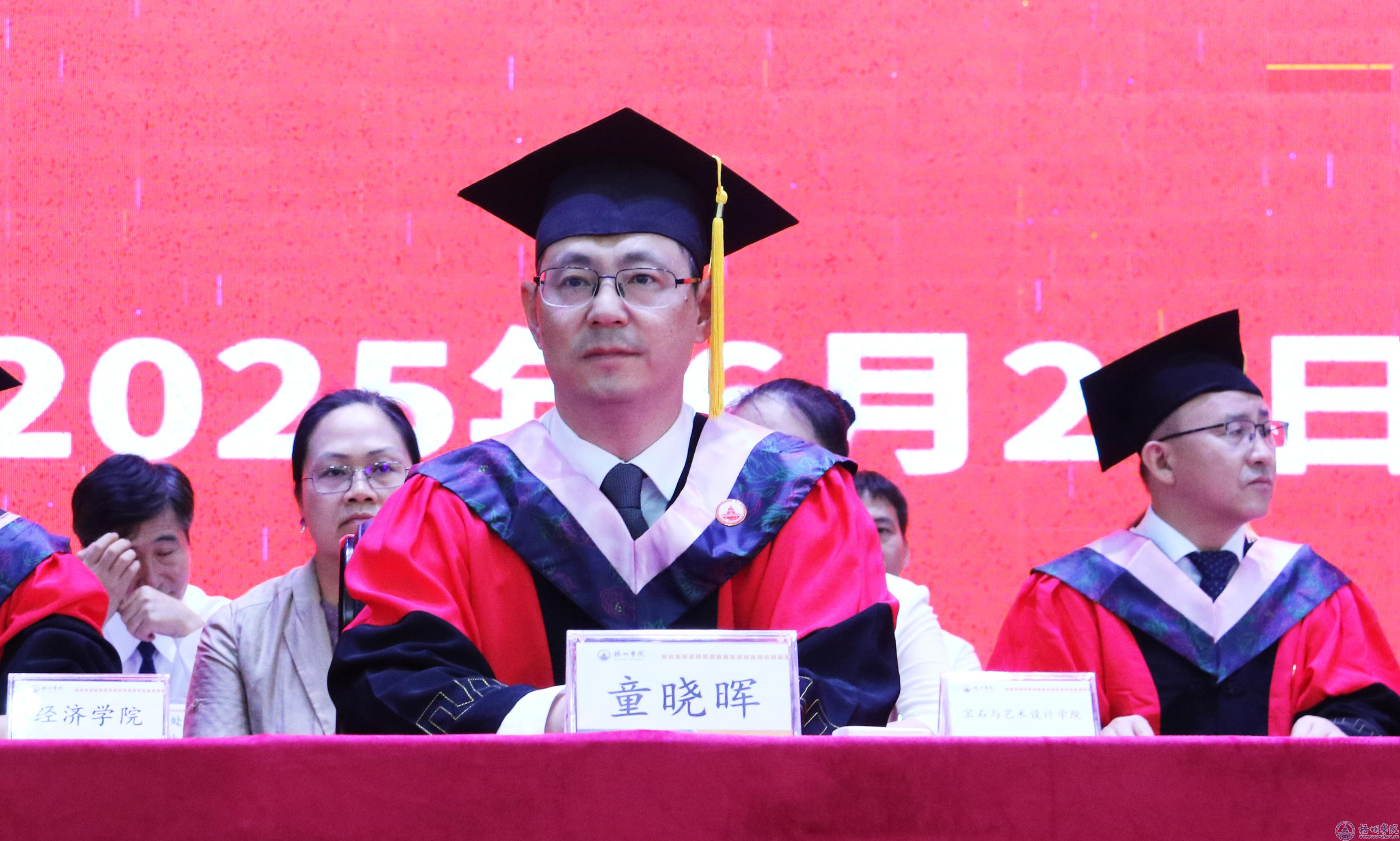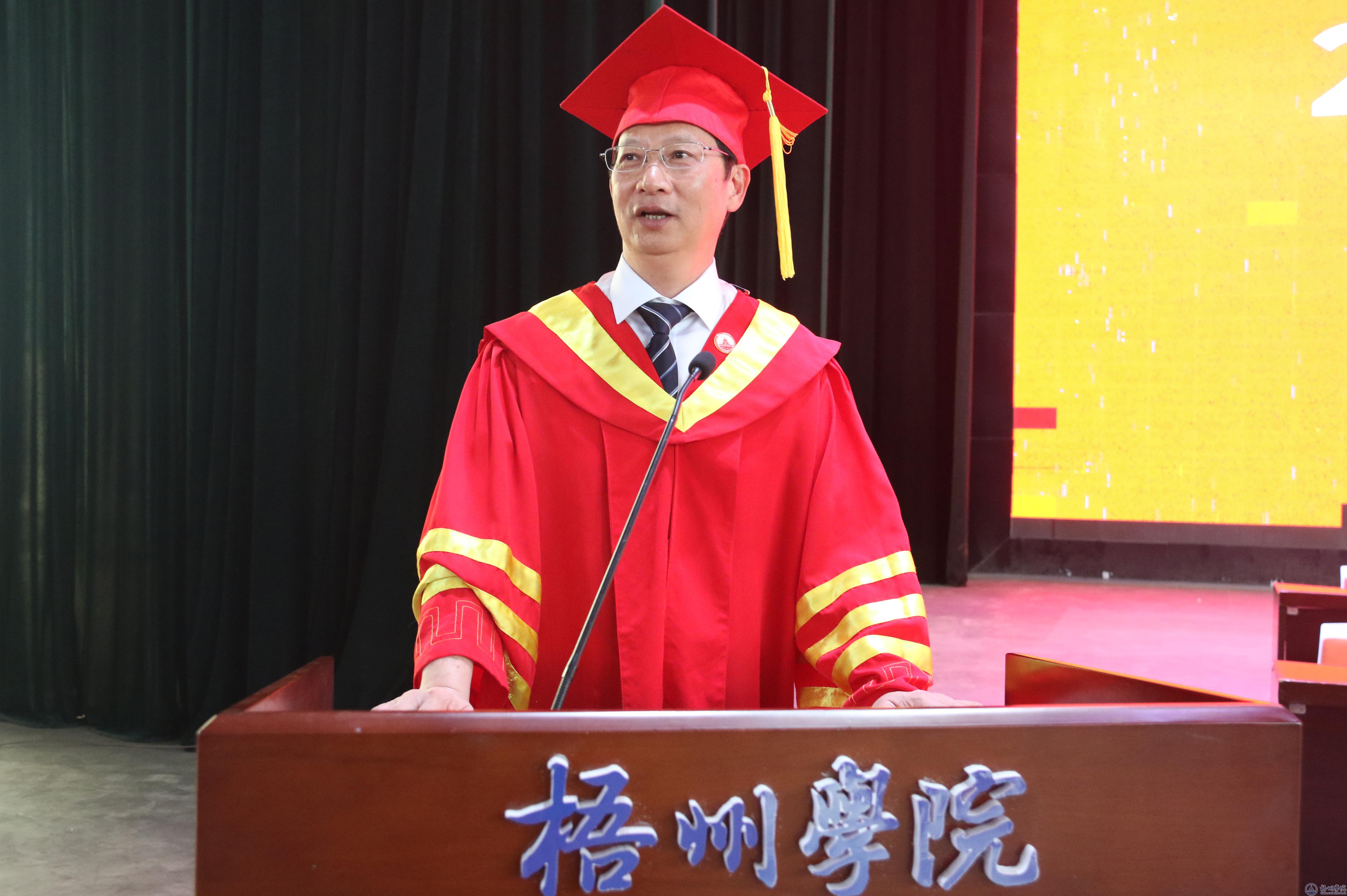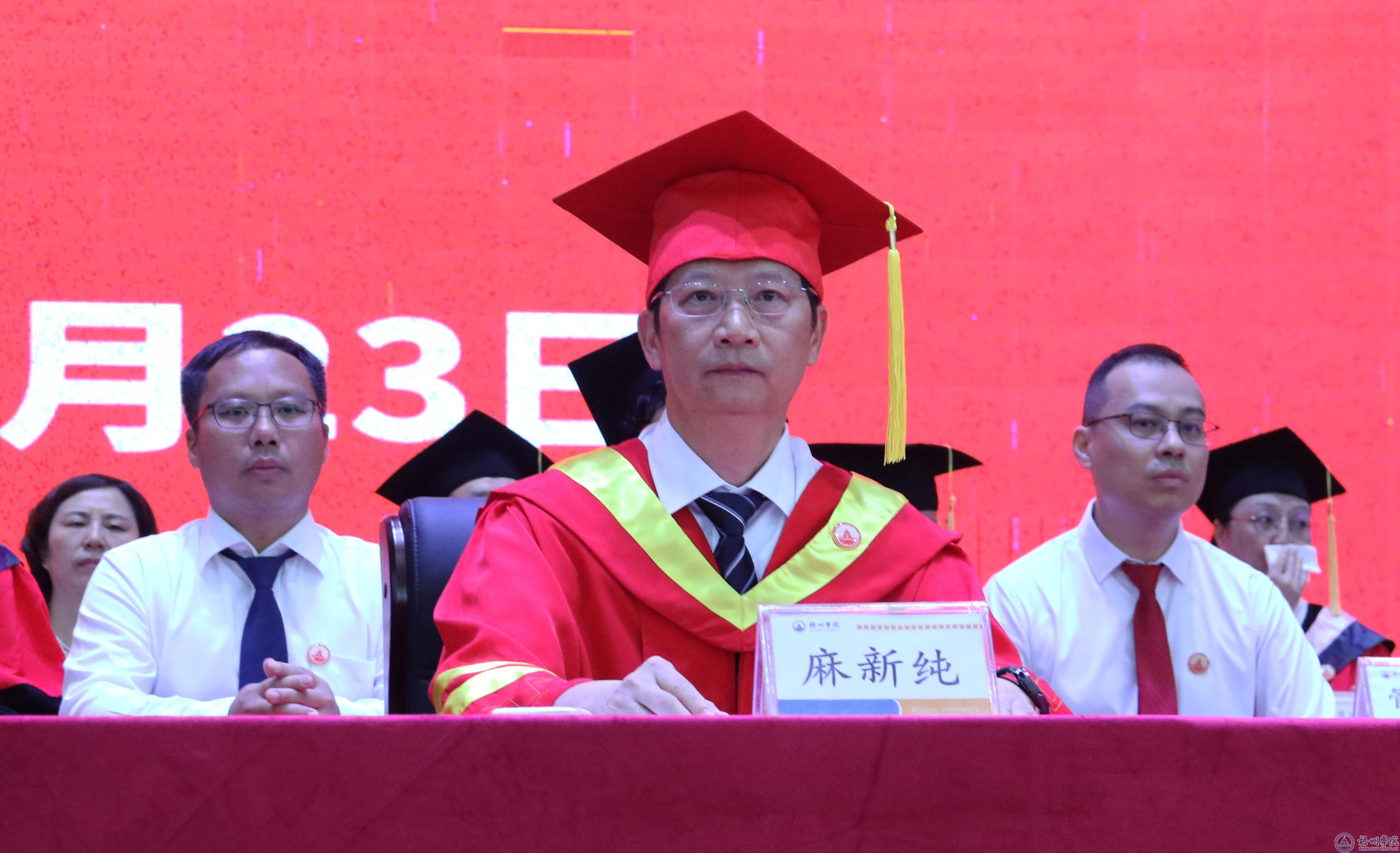 麻新纯校长以《守正创新,逐梦远方》为题致辞,给将要高歌远行毕业生送上深切祝福和殷切嘱托,向辛勤培育的师长、家人、校友致以衷心感谢。致辞中,他与毕业生们一同回首了大学四年的青春硕果,从课堂求知到实验室探索,从图书馆书香浸润到社团协作成长,从宝石创意工坊到人工智能实验室潜心钻研,毕业生们将“明德、博学、求是、创新”校训融入成长血脉,他特别点赞全体毕业生,认为无论是受表彰的学霸、科研新星,还是默默奋斗的“正能量担当”“社团能手”,都是校园画卷的亮丽风景。麻新纯寄语毕业学子学子以“厚道、豁达、实干、细致”的校风为底色,做待人诚恳的厚道逐梦人、做胸怀坦荡的豁达奋楫者、做脚踏实地的实干笃行者、做严谨暖心的细致践行者,愿毕业生们如西江之水奔涌向前,在粤港澳大湾区等时代舞台上锚定目标、逐梦远方,永葆“历尽千帆仍是少年”的赤子之心。